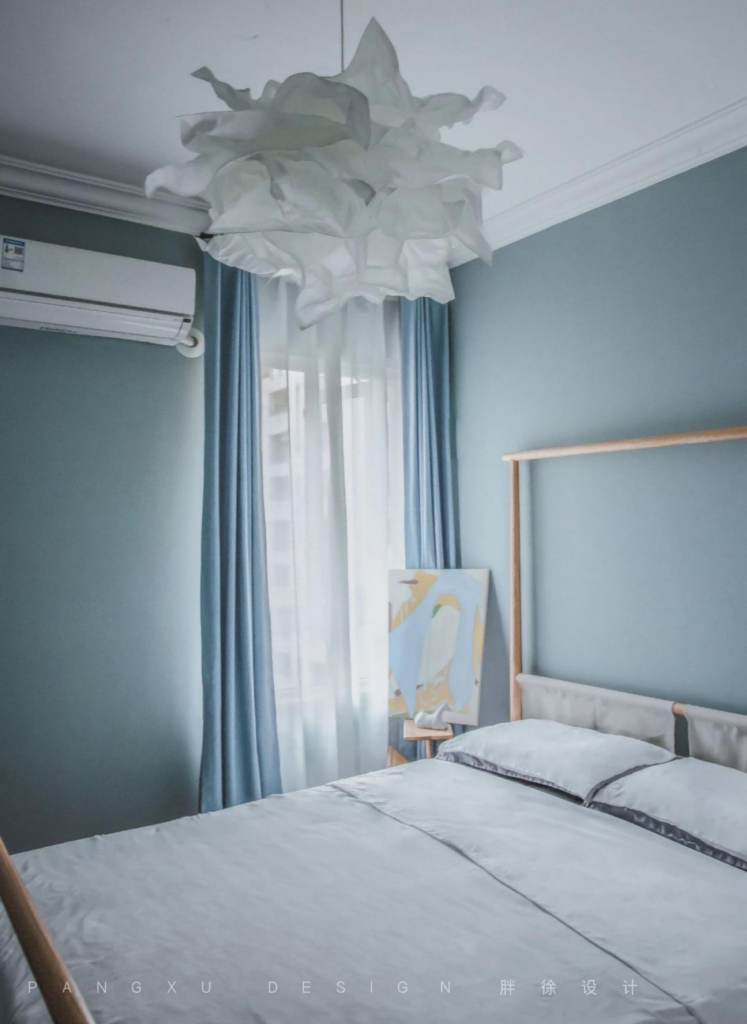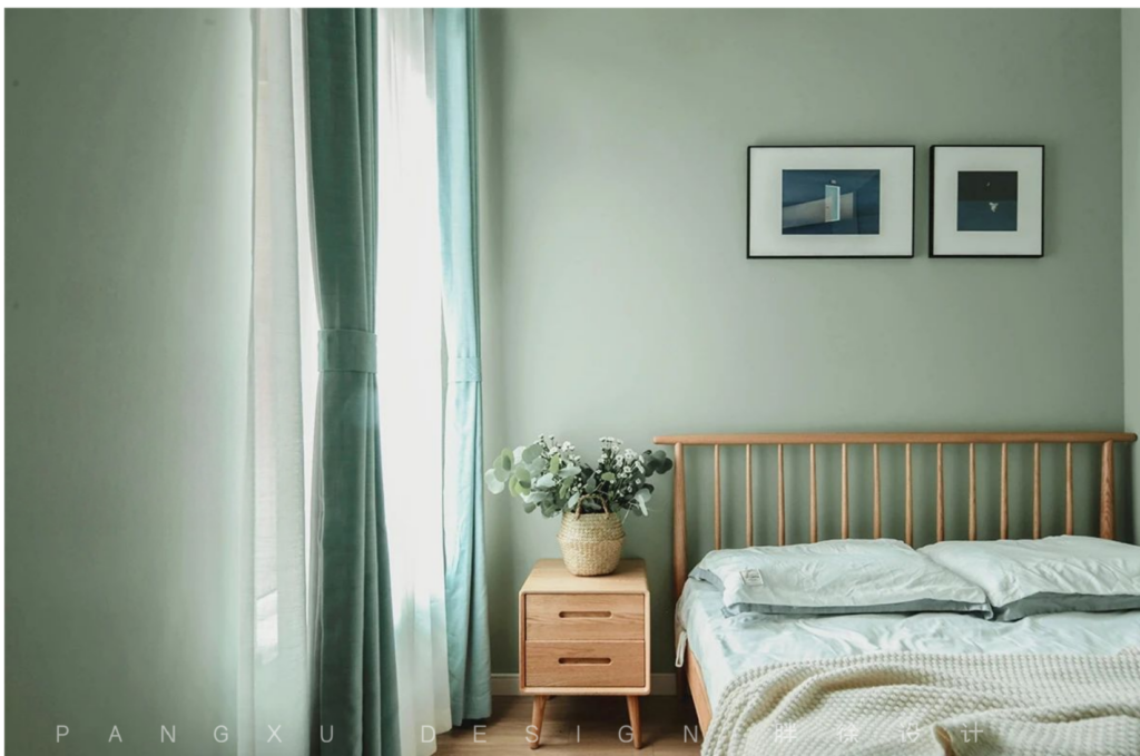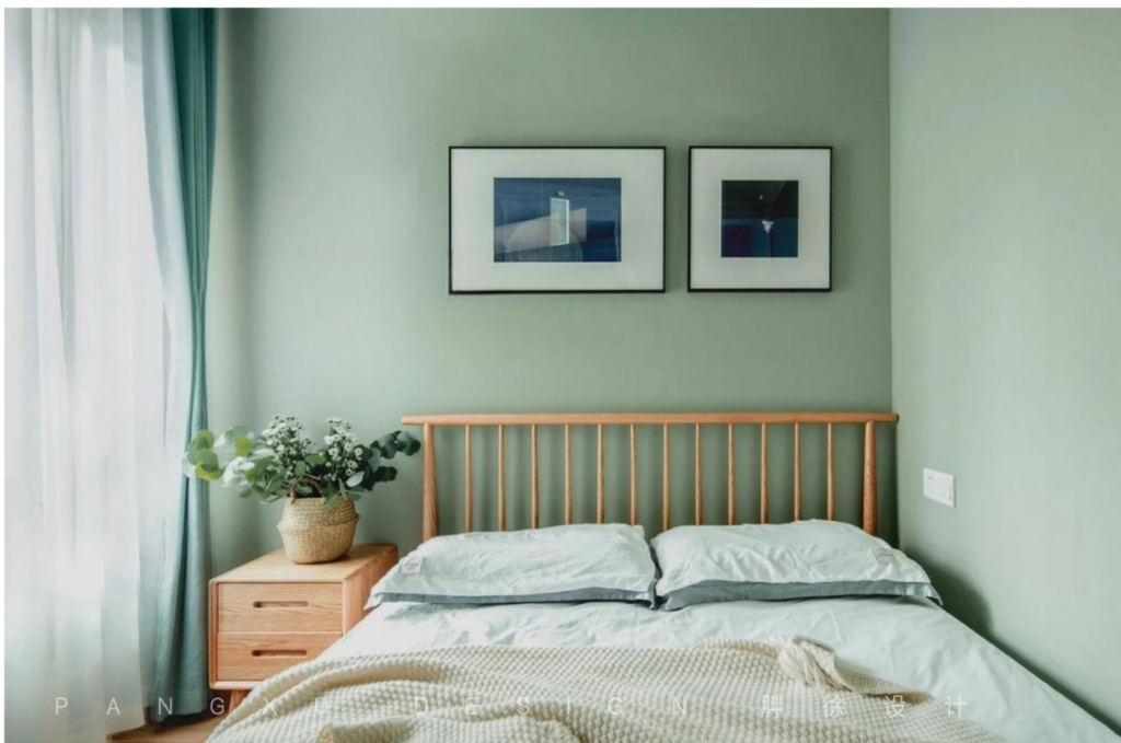 @胖徐设计工作室:次卧的主色调是代表春天的绿色,整个清新的绿色设计也使得窗户和空间不够大的次卧看起来也很明亮。