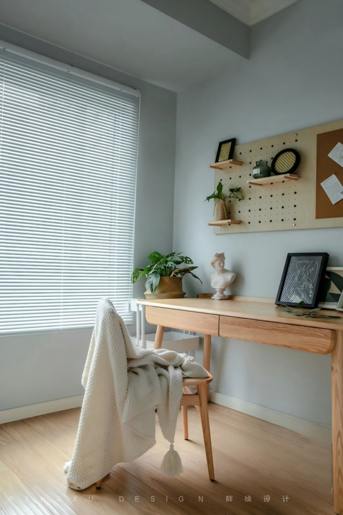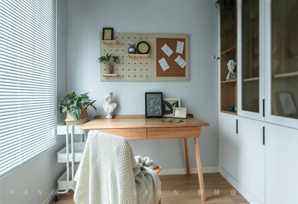@胖徐设计工作室:书房的主色调是来自冬天的白,相比于纯白的墙色,灰白的墙色更显高级,房间的整体的色调也更显柔和,非常适合书房的学习工作氛围。书桌上安装的洞洞板,也方便粘贴一些工作安排表或摆放一些装饰小物件。