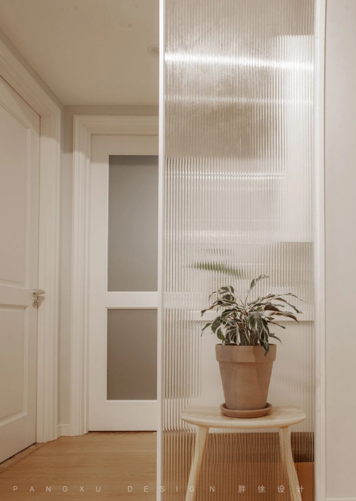 @胖徐设计工作室:卫生间外面的洗手台选择用长虹玻璃将其单独隔开,在保持整个房间风格统一的同时,又增添了一丝朦胧美。