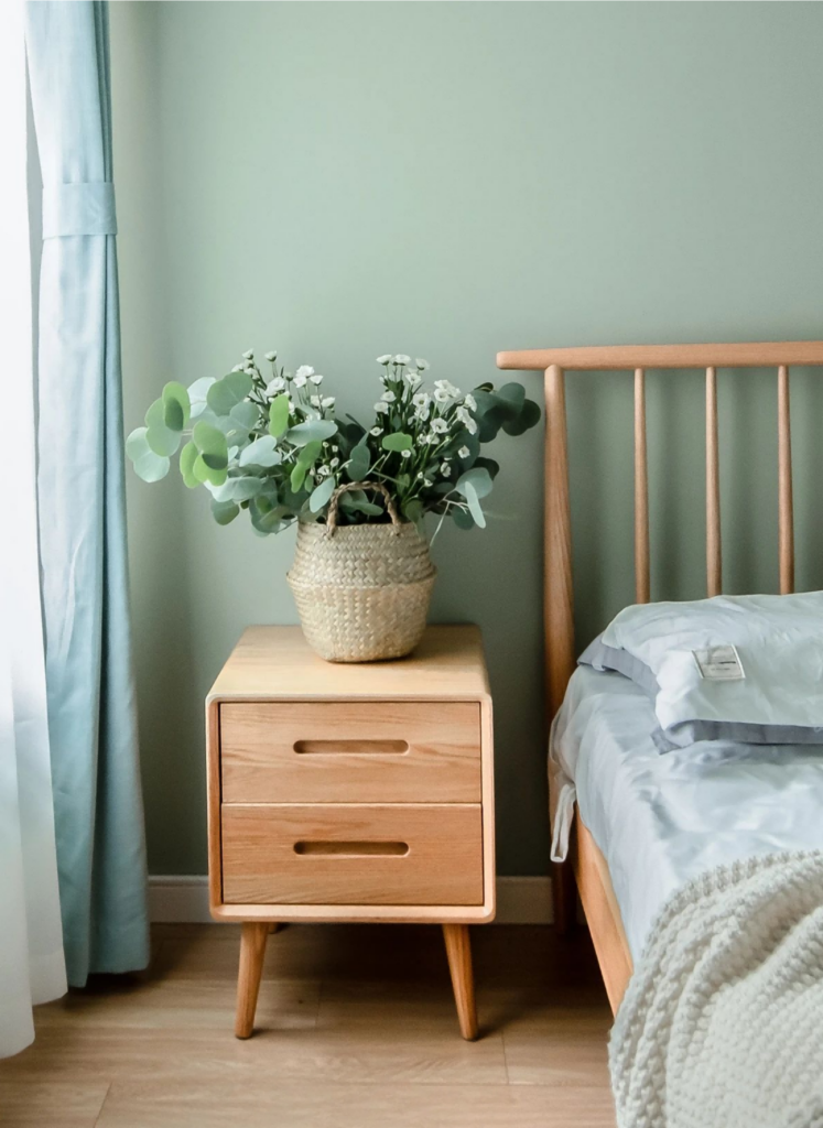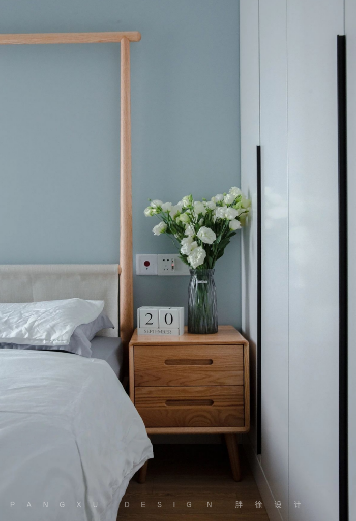 @胖徐设计工作室:原木的床头柜上摆放的插花草编小花篮也为整个卧室增添了一丝活力。
