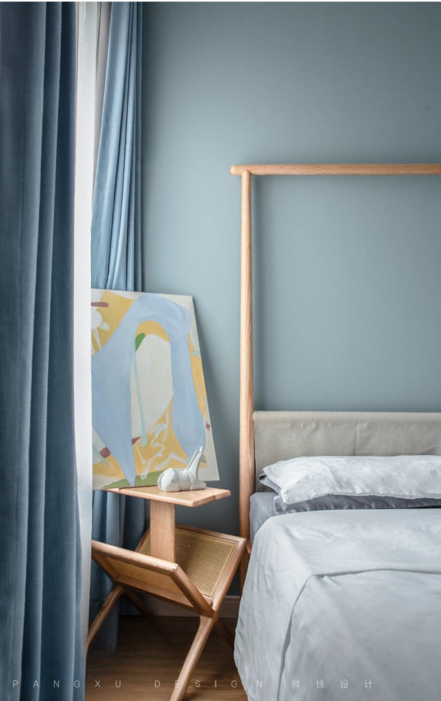 @胖徐设计工作室:书报架巧妙的代替床头柜使用,桌面上搭配一幅设计师的艺术创作画来装饰,恰到好处,整个卧室看起来温馨又充满艺术感。