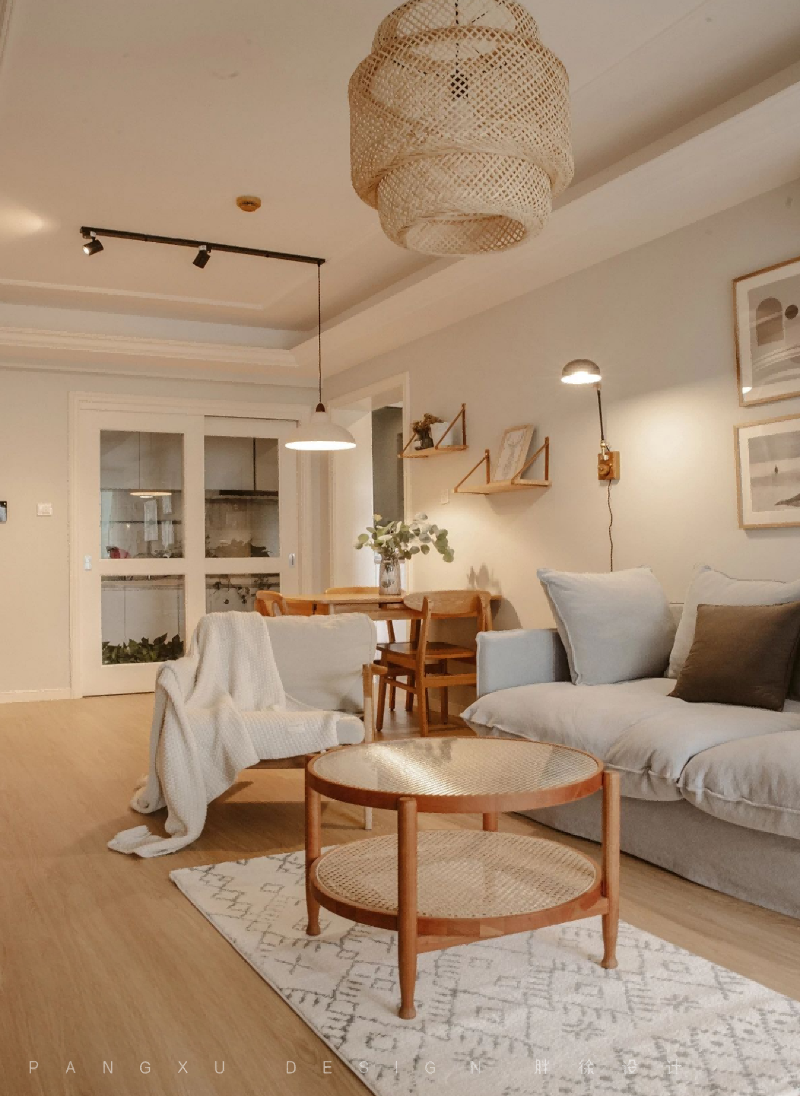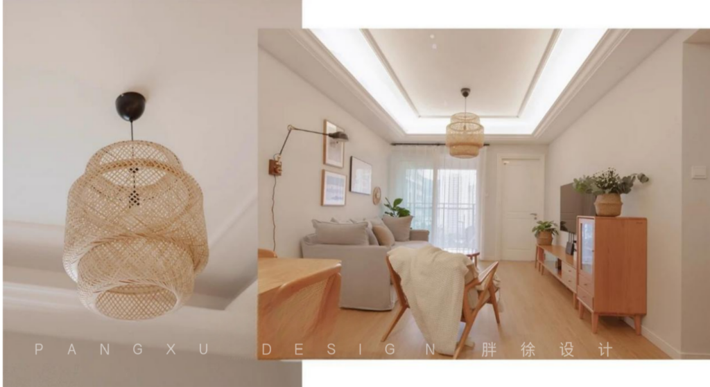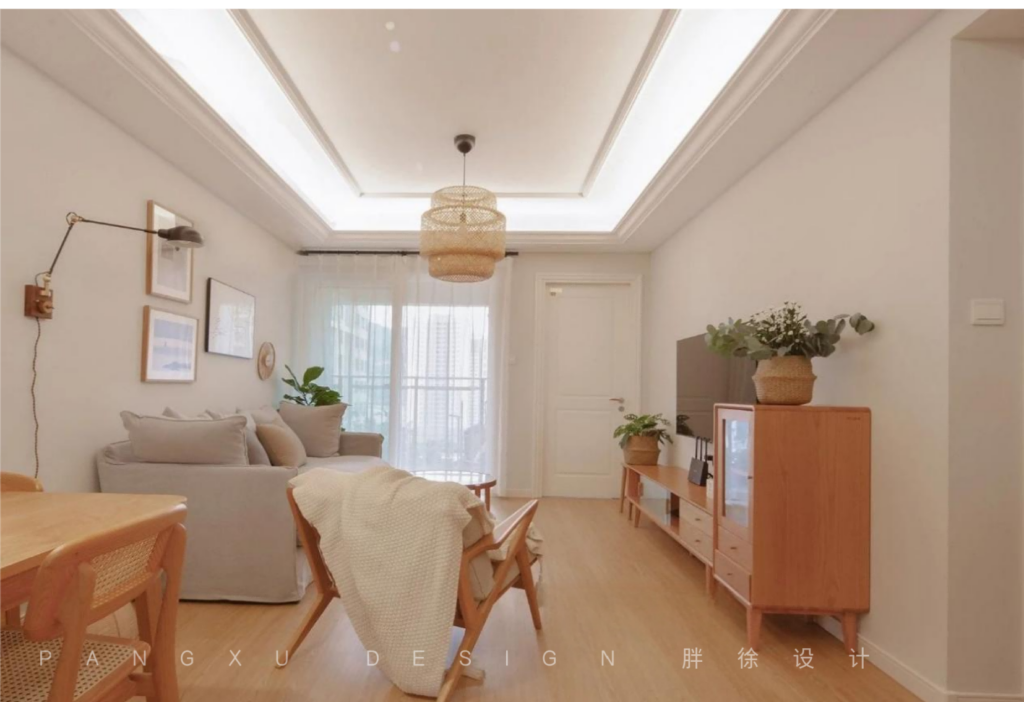 @胖徐设计工作室:客厅除了实现整个客厅基础照明需求的主灯,还设计了烘托氛围感的辅助灯带,在保证了整个客厅的明亮度的同时,搭配颜色简单的原木家具,温馨又自然。