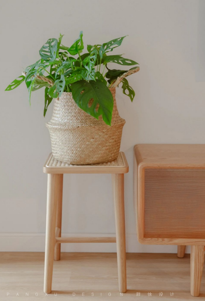 @胖徐设计工作室:木制电视柜旁搭配手工的草编花篮,清新又自然,放一株养眼的绿物,治愈满分。