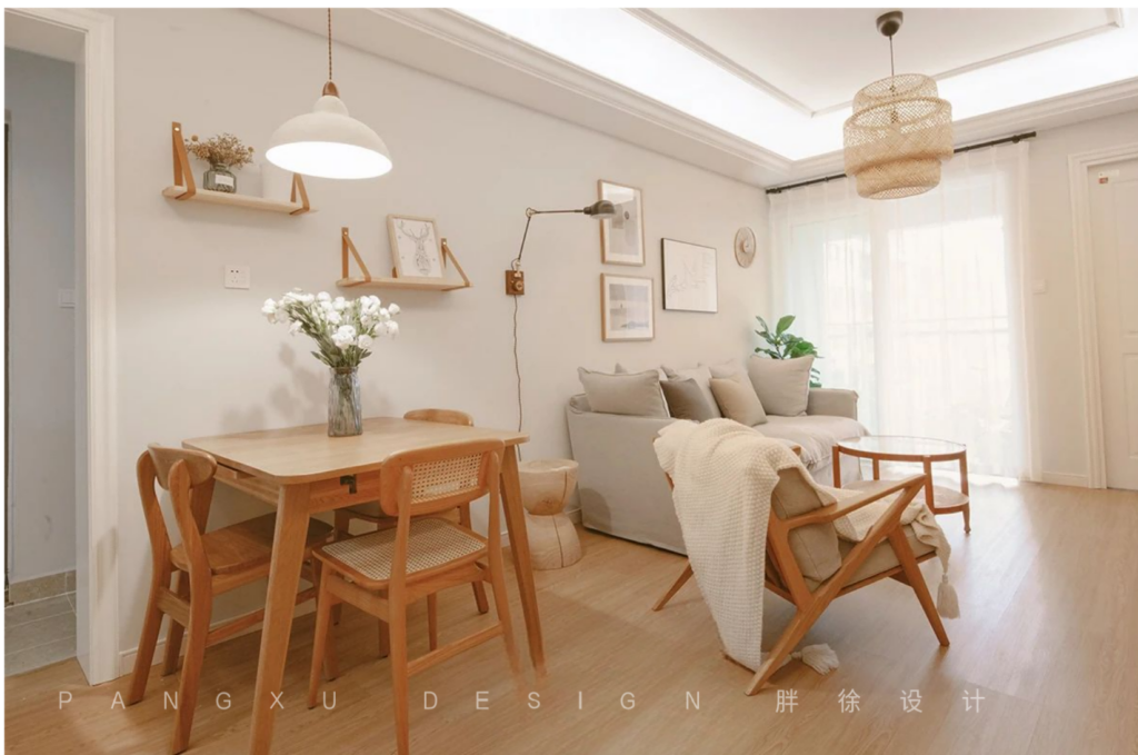 @胖徐设计工作室:餐厅和客厅是一样的暖黄系,餐厅的饭桌有自带的小抽屉,放一些纸巾和用餐的小刀叉,方便又美观。
