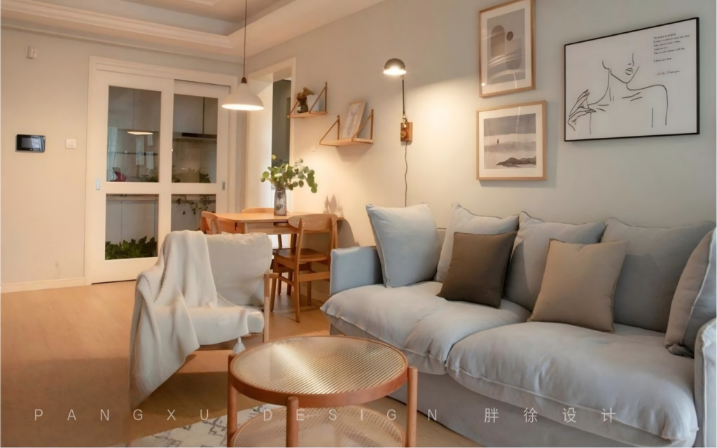 @胖徐设计工作室:客厅的主色调是属于秋天的暖黄色,搭配浅灰的布沙发,十分温馨舒适。深夜,打开沙发后的壁灯,读一本书,看一部电影,都是享受。
