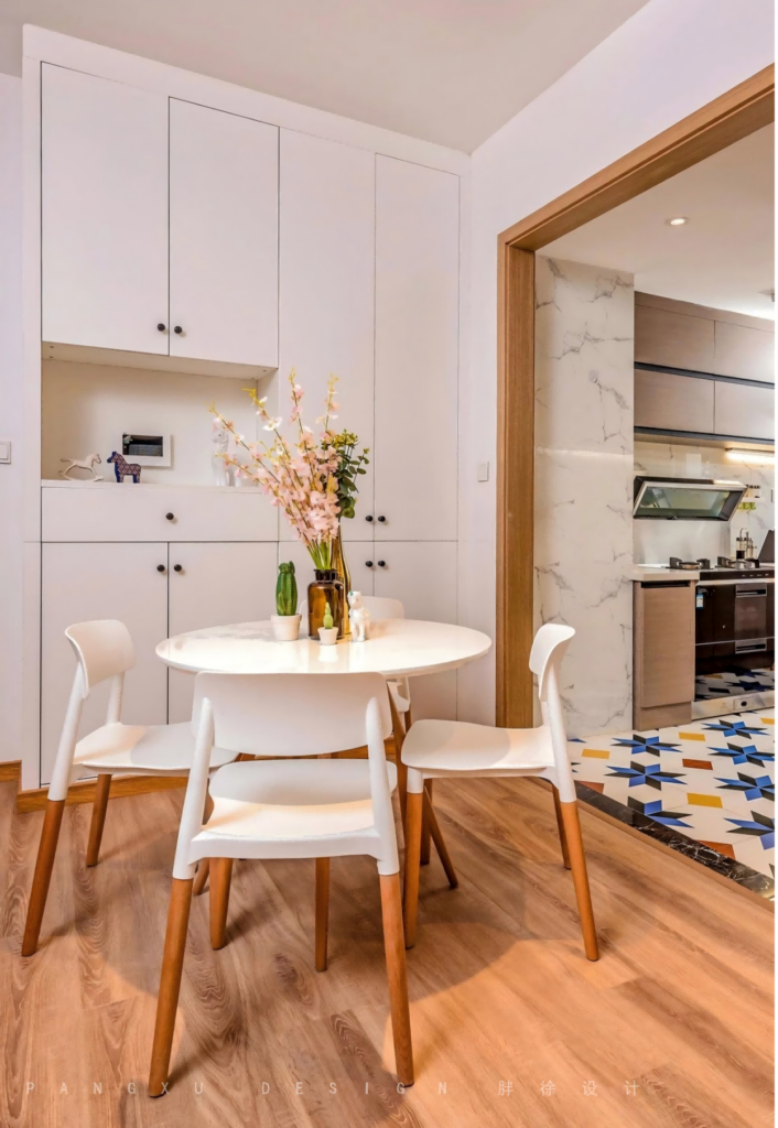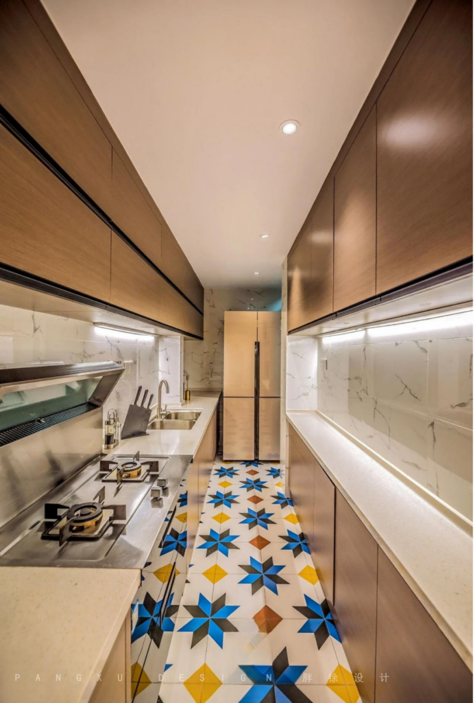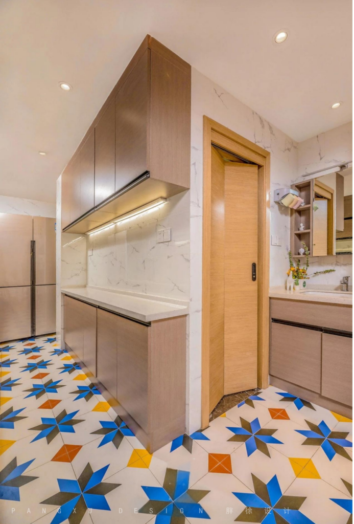 屋主喜欢自己下厨邀请亲友来到家里做客,所以厨房是她的生活需求重点。原本的户型内,厨房比较狭窄,然后屋主身高也比较高,就显得原始户型内的厨房更加小了。我们打开厨房的面积,没有使用门来做封闭,使用集成灶,做了一个开放式厨房,改变了冰箱的位置,一个爱下厨的人需要更多的储物空间,我们改造了厨房的设计增加了另外的橱柜,方便她日常使用。