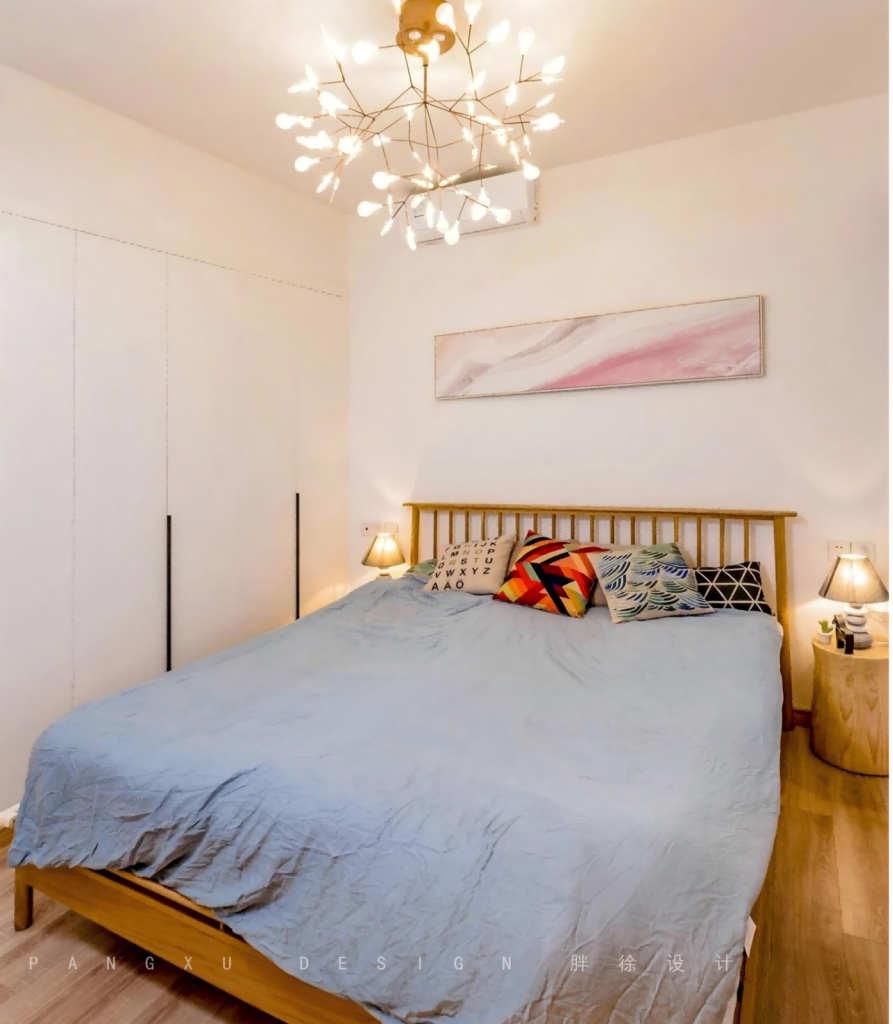 屋主是拥有模特身材的高挑女生,所以设计之初就提出来需要一个超大超长的床,但是原始空间如果放下了大床就放下衣柜,放下衣柜就没有大床,所以在设计中,我们改变了卧室的使用面积,从客厅和卫生间借了一点面积,不影响其他空间的使用,却使得卧室面积变大,能够放下一张舒适的床,卧室也拥有了一面超大的衣柜。