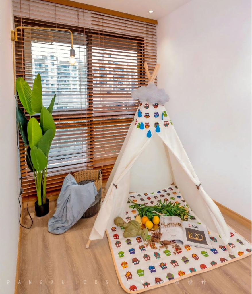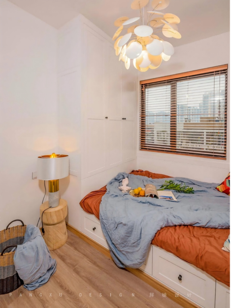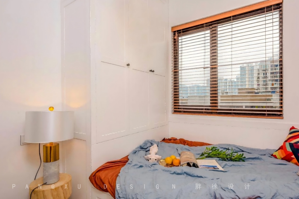 次卧室做了一个简单的榻榻米床,床背后是次卧室的衣柜和收纳空间,这样的设计方法不会因为空间狭小导致空间生活局促。