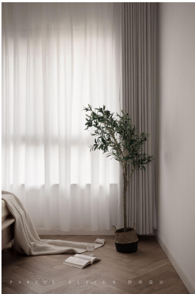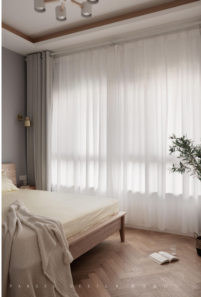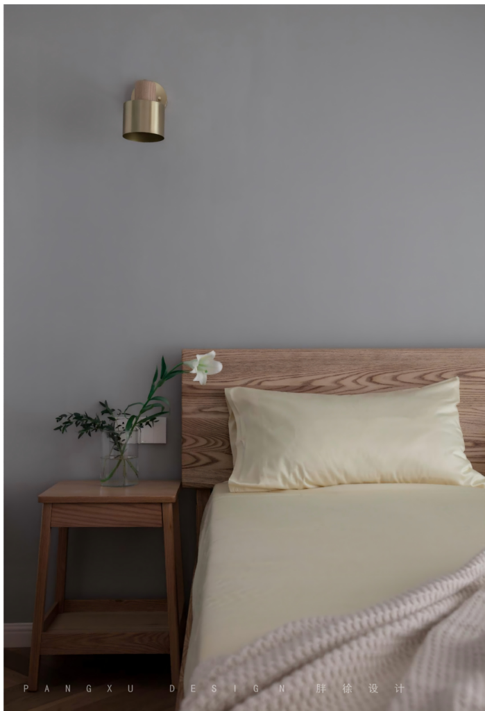 @胖徐设计工作室:主卧室素雅整洁,五十度灰的背景墙,淡淡、默默地散发静谧感。不再折腾于年轻的冲动而归于沉稳,追求内心的那份宁静。
