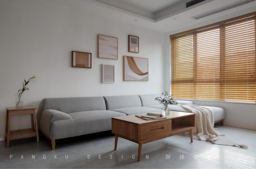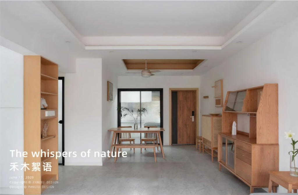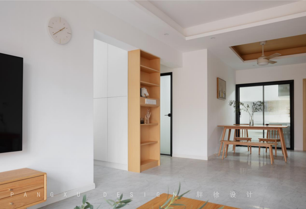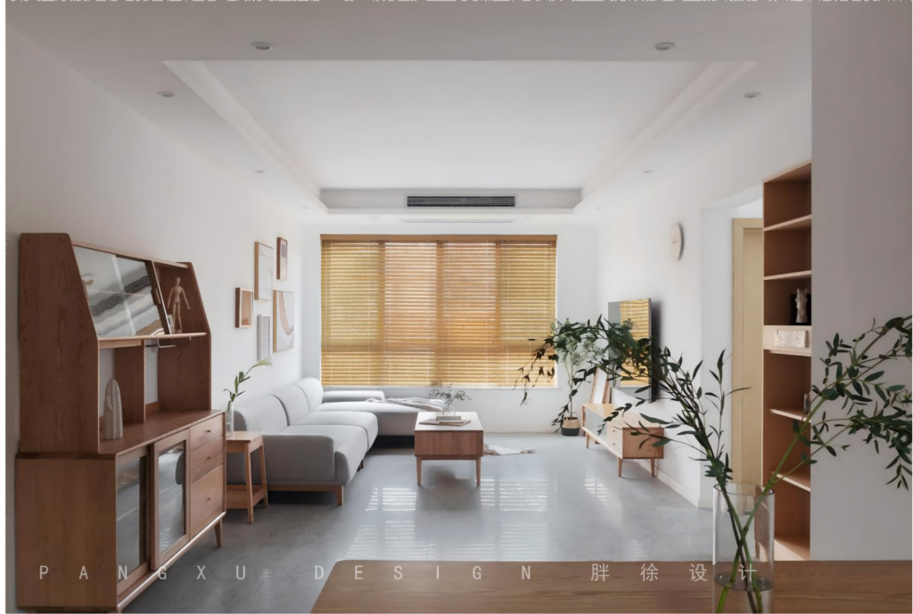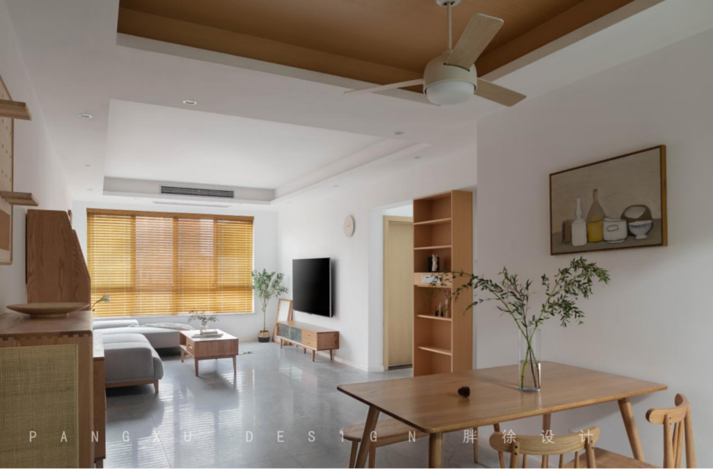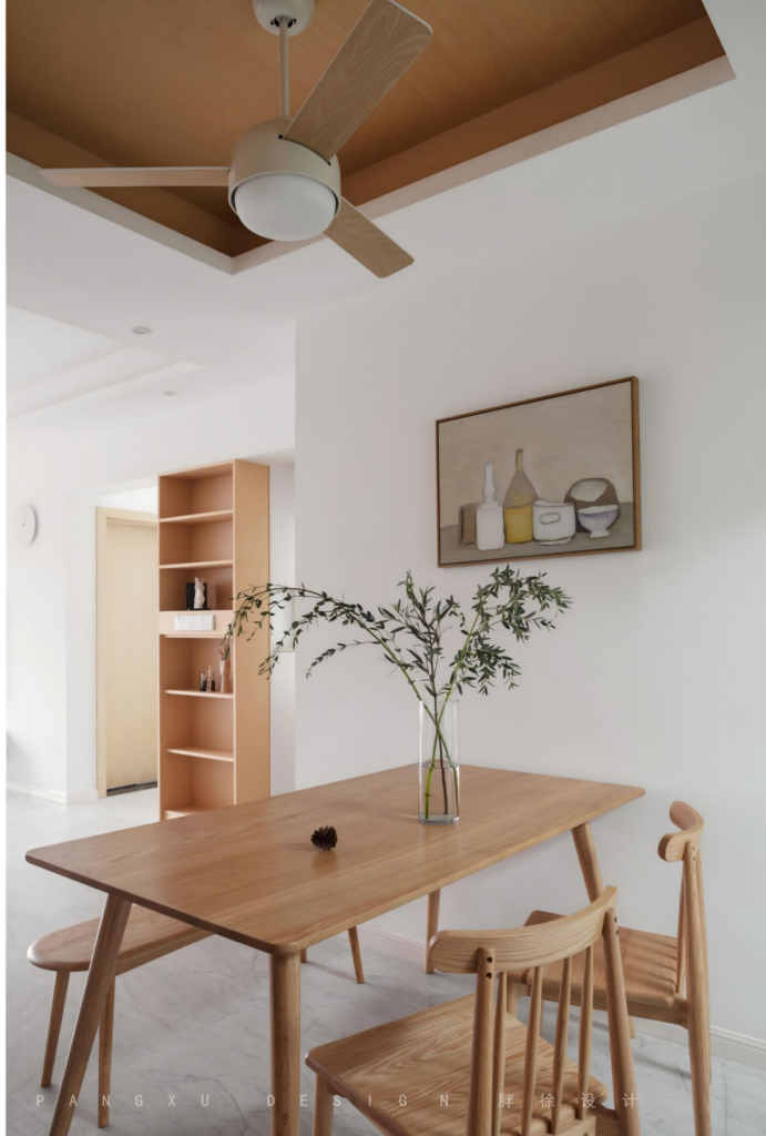 @胖徐设计工作室 :用餐区和待客区打通一体无分离,利用家具的摆放自动区分就餐与观影功能。除了必备的边柜、边几、沙发等等实用实木家具,清爽、原木天然的质感,多一分都多余。客厅的顶部我们也采用了和餐厅类似的回形设计,保证遮挡风管机的吊顶美观前提下,视觉增加层高并随之呼应餐厅的顶部设计。使之成为一体。