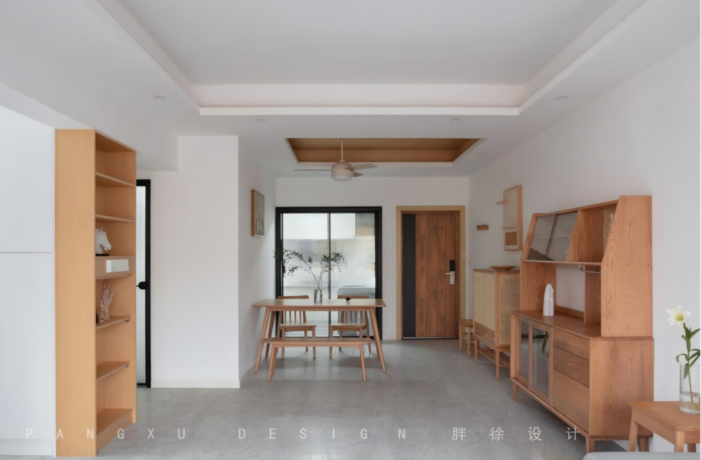 @胖徐设计工作室:在入户玄关的位置我们把原建筑红棕色的防盗门换成了更适契合整风格调性的现代日式防盗门,没有把鞋柜设计到顶部去也是为了加大入户时的视觉通透感,多出来的换季鞋子我们最后把它们设计收纳到了楼梯间的储藏柜中,等一下可以看到。在餐厅的顶部我们考虑了洗顶的回形灯光个造型,内部在贴上统一的材质的木质饰面板,让润软的木质感能包裹整空间。