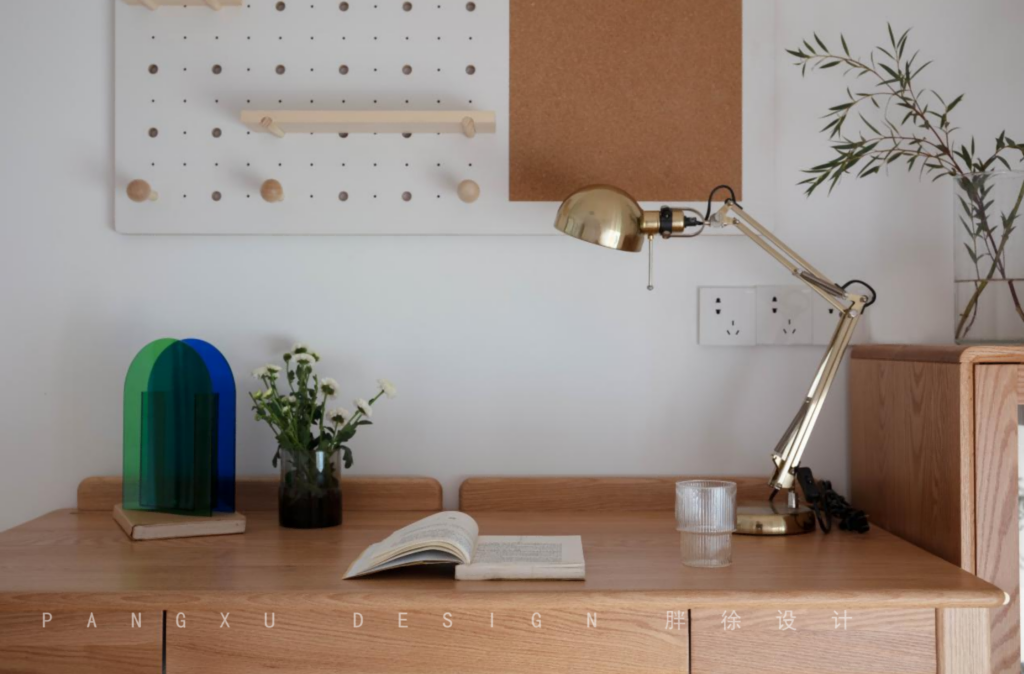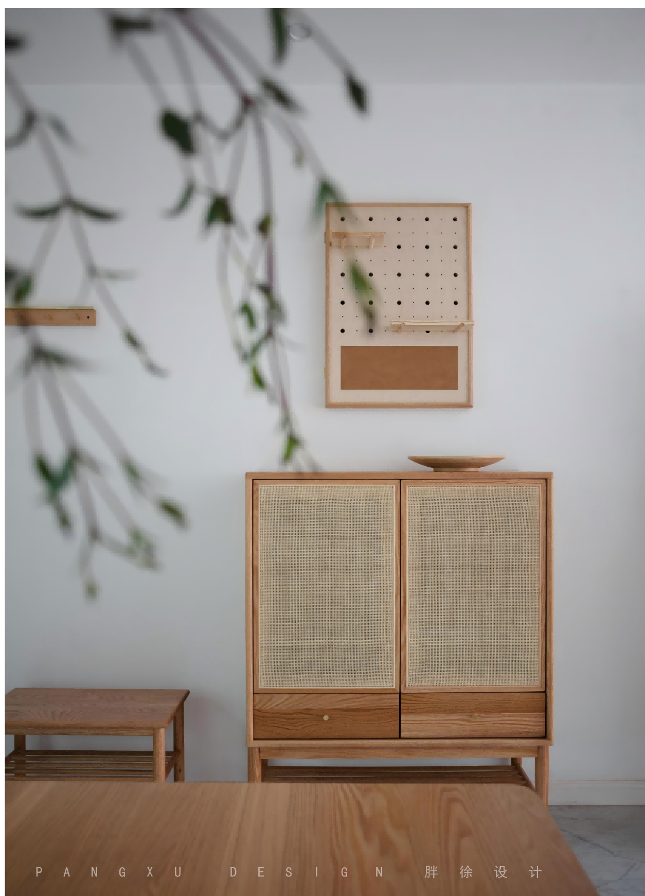 @胖徐设计工作室:在玄关处也预设了一个换鞋凳和衣帽挂架,方便出门时候换鞋的便利性。木质洞洞板增加零散物件挂置的趣味性,小盆栽,钥匙,便签或拍立得相片添生活小情调。