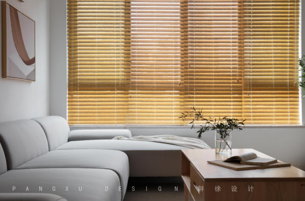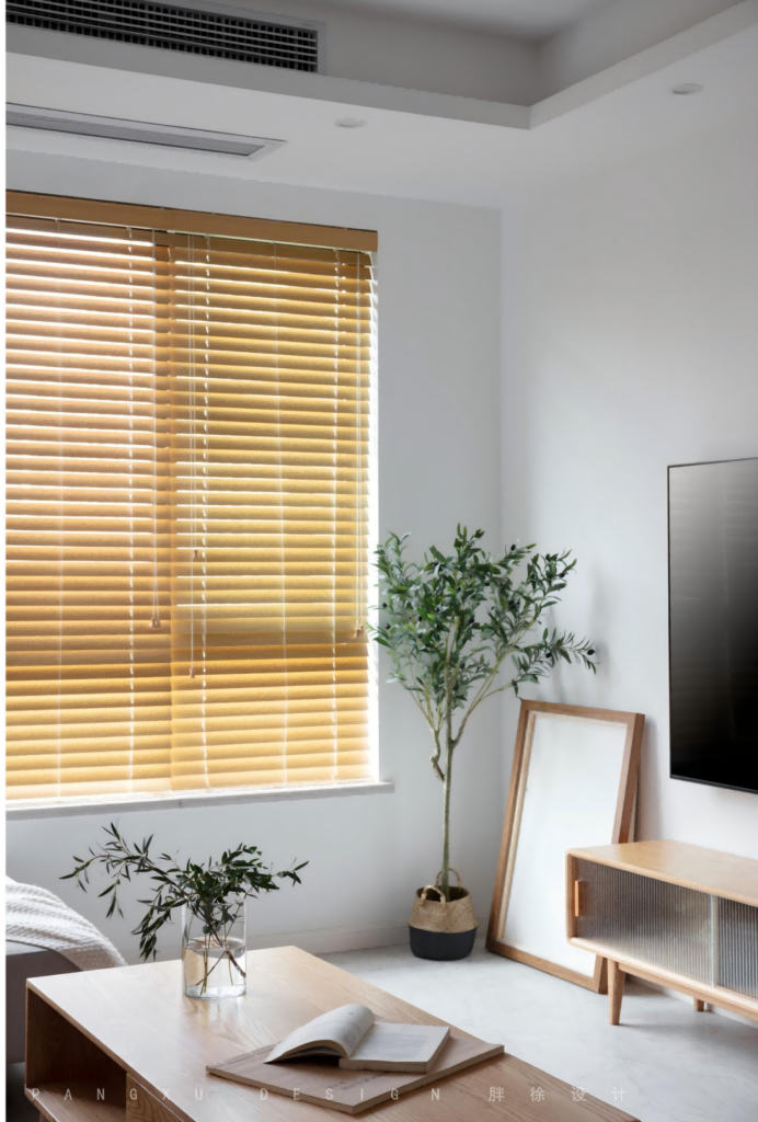 @胖徐设计工作室:竹木百叶帘,迥异于平时惯用的布艺窗帘,与主题基调呼应并可随时根据时日光照调节室内明暗光线。当阳光顺着百叶帘洒到地面上的时候儿时的味道跃然而出。