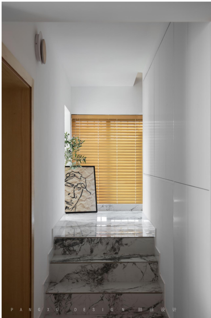 @胖徐设计工作室:过道楼梯从一层延伸二层,满铺水墨状的大理石砖纹,纹路洒脱俊逸,质感通透。右边墙面是暗藏与楼梯间的储藏柜,换季的鞋子和杂物都可以收纳其中。