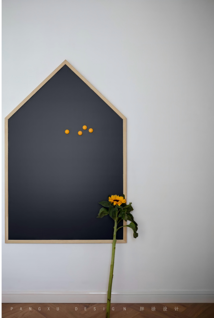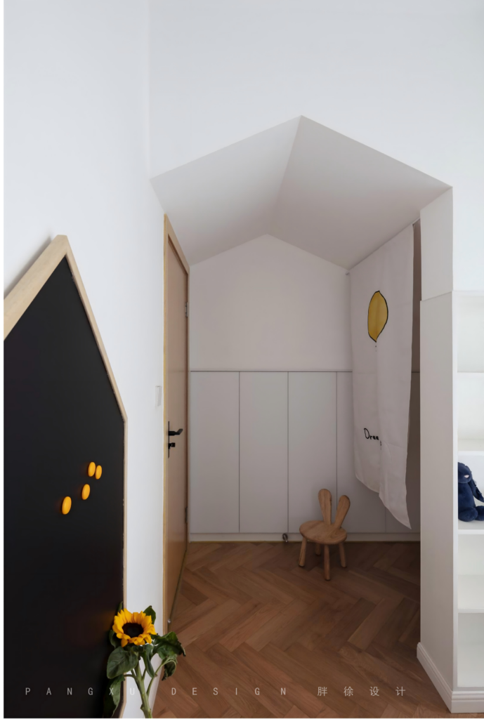 @胖徐设计工作室:可爱的屋型拱门下隐藏式柜体放置孩子衣物,门边的磁性儿童黑板墙,在预防孩子随处乱涂乱画下提供一个可以随性发挥的区域。既丰富艺术氛围,又方便大人清洁擦洗。