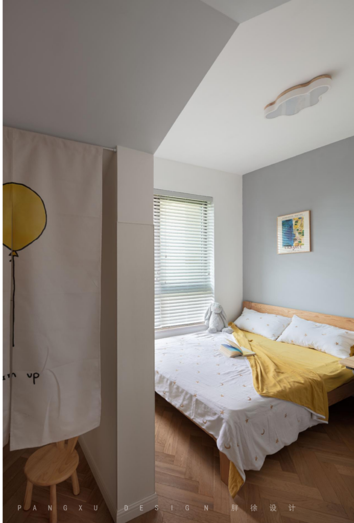 @胖徐设计工作室:儿童房趣味的门洞结构,无过多稚嫩元素适用孩子各个成长阶段的舒适。在满足孩子睡眠,读书的情况下,利用楼梯下的狭小空间设计隐藏式柜体和捉迷藏互动空间。满足幼童对自我空间的探索欲望和安全感。