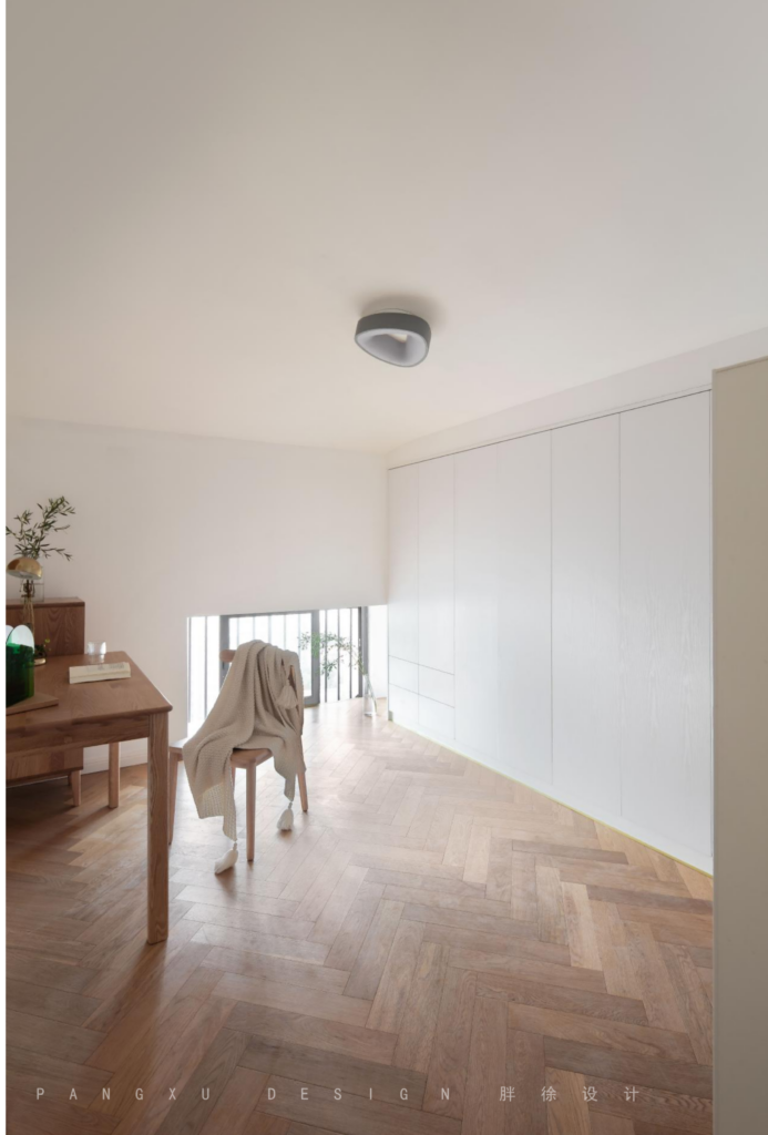 @胖徐设计工作室:二楼的书房空间保留了原始建筑的斜剖屋面结构旁配合地面的人字拼木地板让整个空间更加具有趣味。