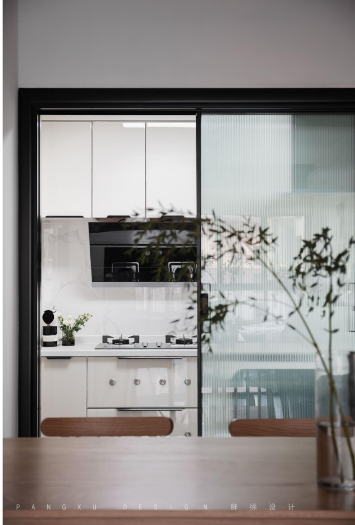@胖徐设计工作室:厨房门我们使用的是长虹玻璃,在不失通透感的前提下又兼具了对厨房的视觉模糊化处理。