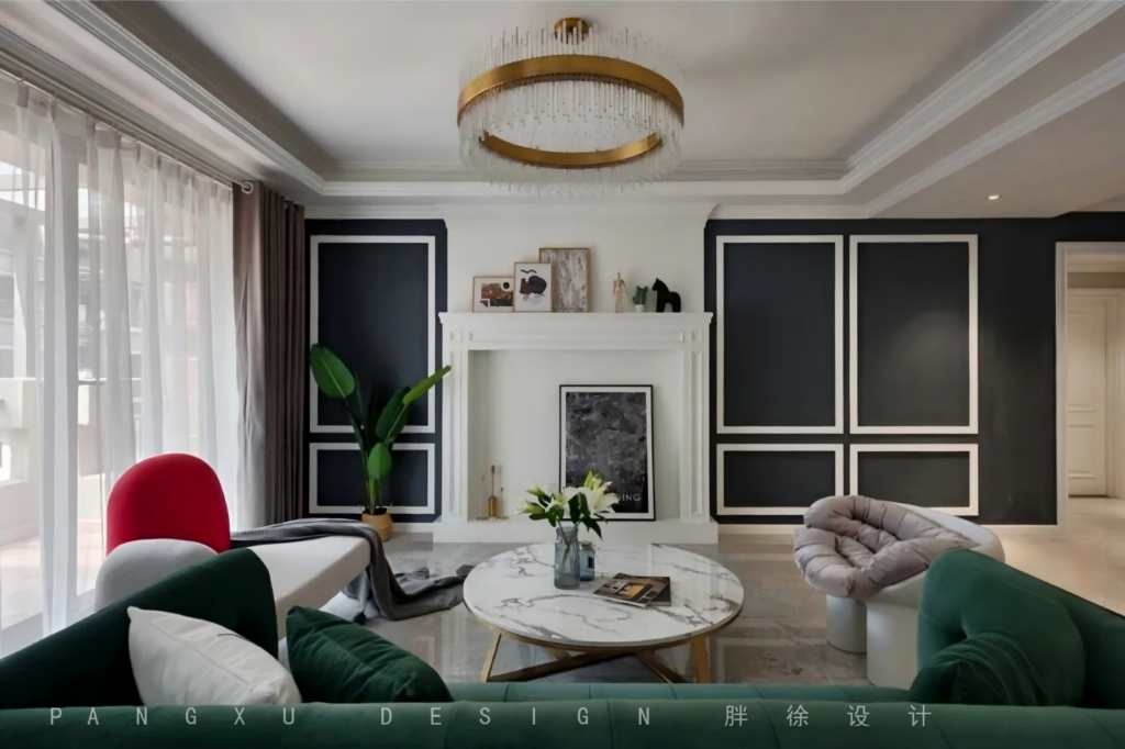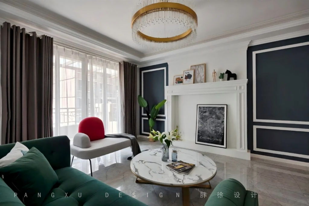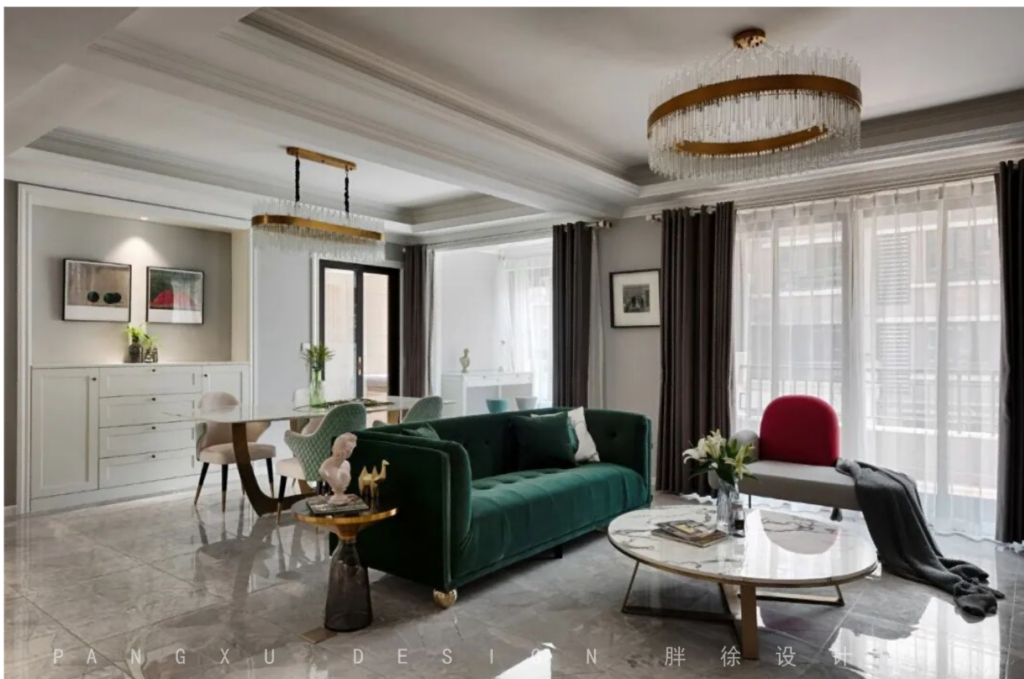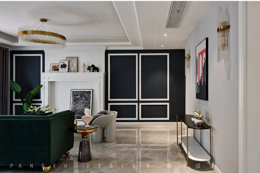 @胖徐设计工作室:最初屋主夫妻二人的风格取向是走简美风格,但是在设计的过程中设计师通过风格图片的分析和引导最终确定了现代美式混轻奢的风格。(设计师这套设计有本案的同一空间的不同风格的两套软装配搭方案,如有有小伙伴想看,可以留言,我们可以把软装表单更新出来)