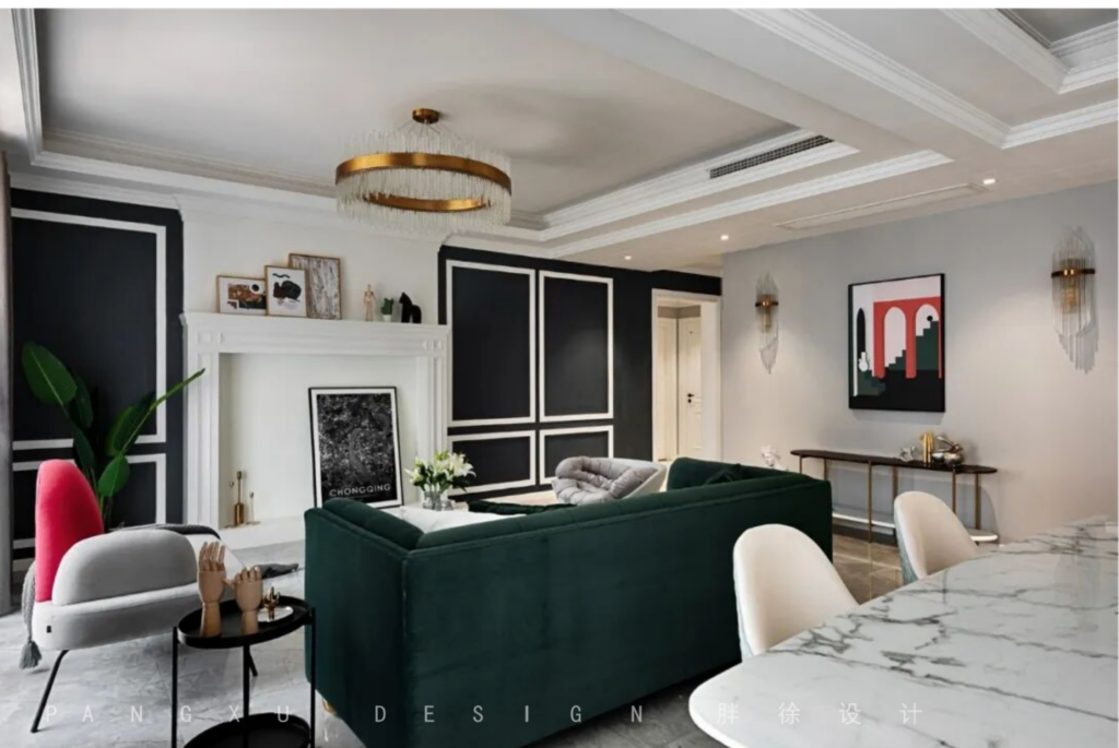@胖徐设计工作室:因为客餐厅的空间是一个长横厅,在原始的结构式顶部还有一根巨大的横梁,设计师巧妙的借助了横梁的高度进行了多吊顶和石膏阴角线的处理方式,让空间更加具有层次感,同时也放空间在视觉上自然的有了空间分区。