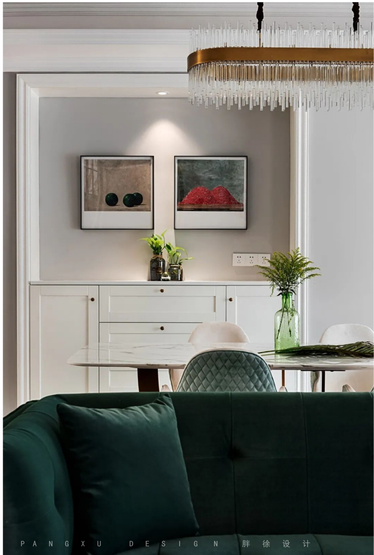 @胖徐设计工作室:餐边柜我们在设计中没有全面的把这个空间做满,那样过去死板了,有凹有凸设计空间才会又有趣。不知道大家发现装饰画上的那副红色的樱桃水彩画没有,其实设计师在进行软装选择的时候就故意和客厅的坐榻做了有趣的呼应,可以回头看看客厅的照片,坐榻的背靠的那一抹红色正好和装饰画有了呼应。设计让生活更有趣。