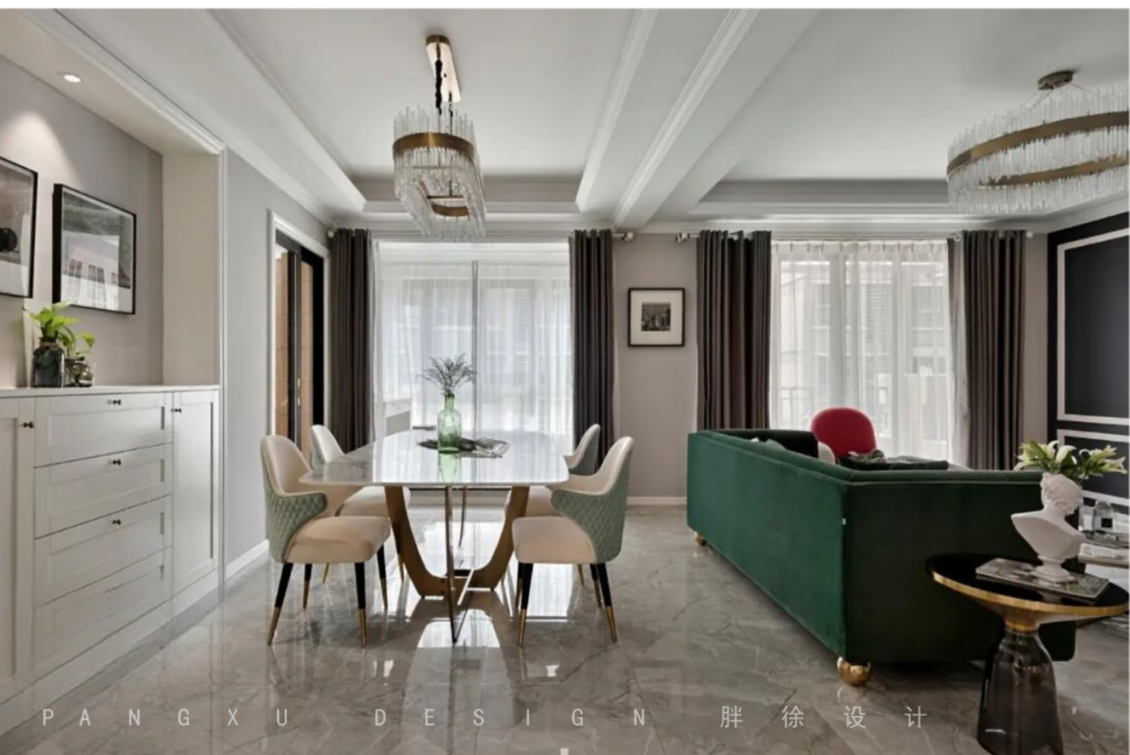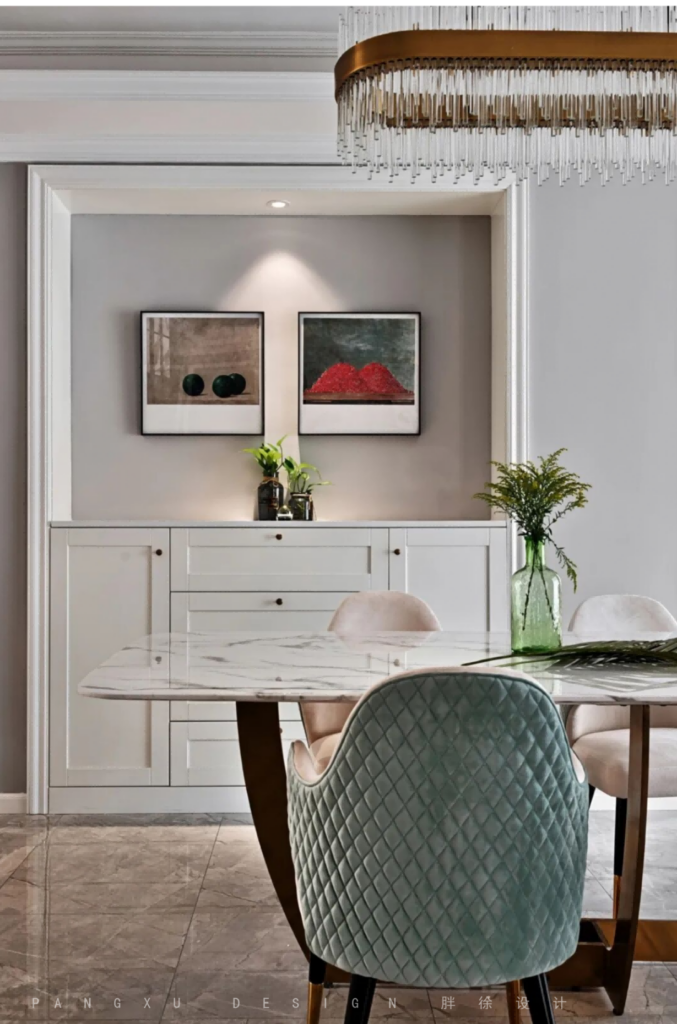 @胖徐设计工作室:餐厅的餐桌选择的是天然大理石台面金色金属脚的轻奢风格的餐桌,餐椅也是刻意的选择的同沙发同色系的餐椅,来保证空间色彩的完整性。
