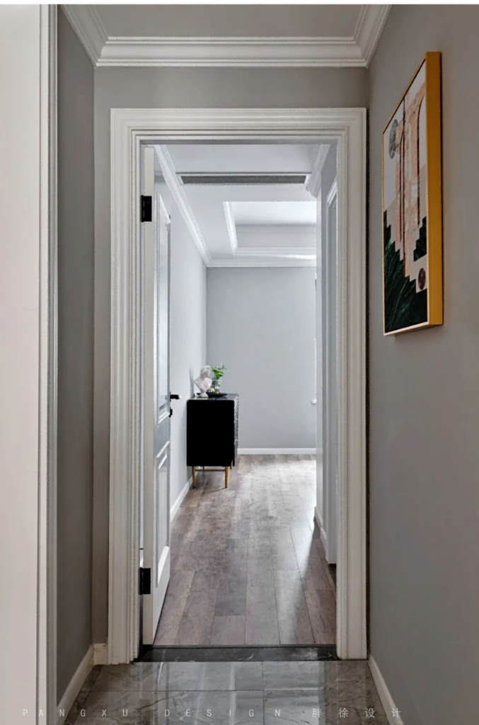 @胖徐设计工作室:在入户玄关的处理上,因为是长横厅的关系,玄关的右边基本上是一面完成平整的墙面,设计师巧妙在墙面上用装饰画、装饰壁灯和薄型的边几让空间有了横向和纵向的凹凸延展,使得空间在间距实用性的基础上更有看点。