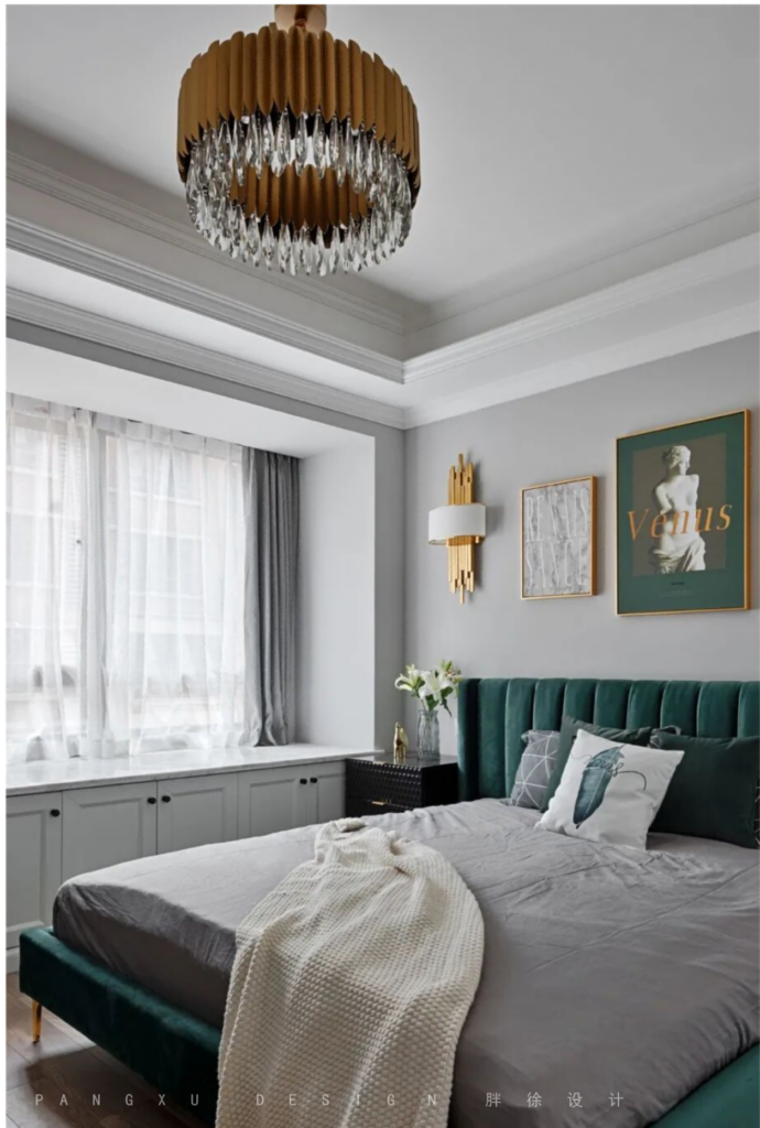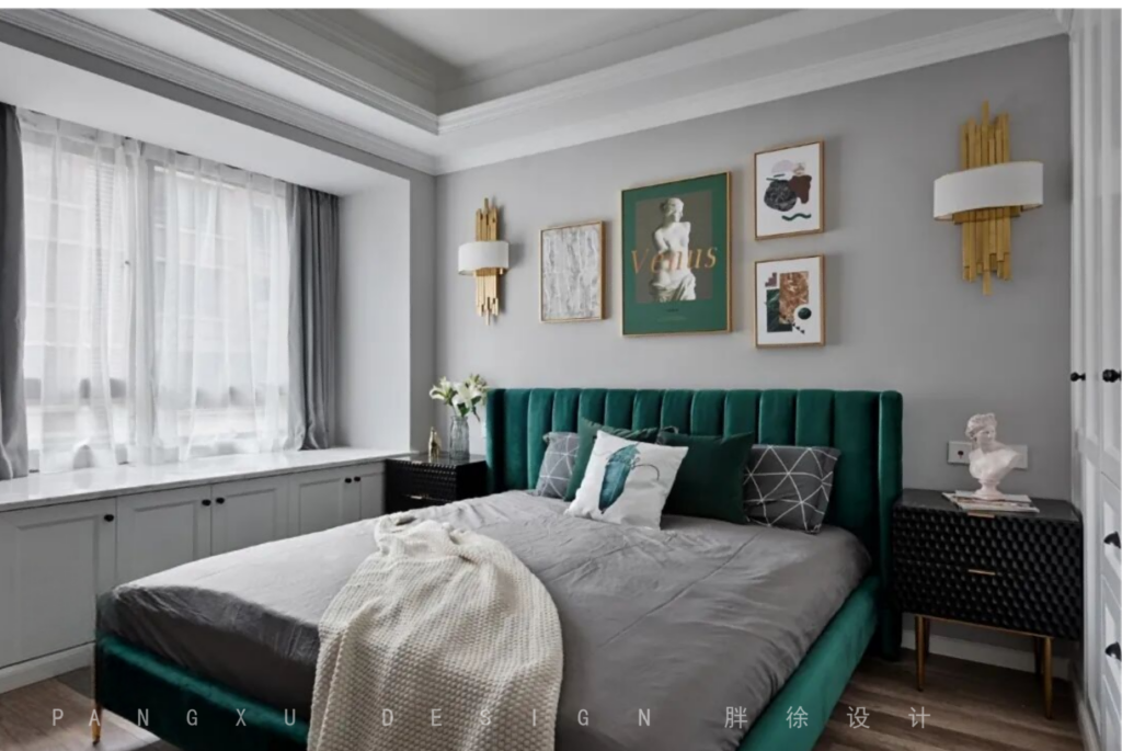 @胖徐设计工作室:主卧室的金色壁灯和金色边框的装饰画都是为了呼应整个空间调性专门设计配搭的。