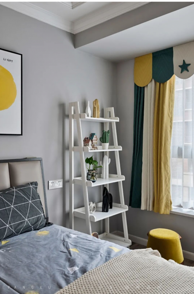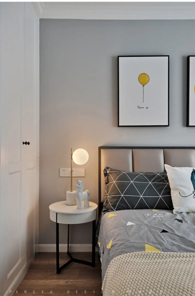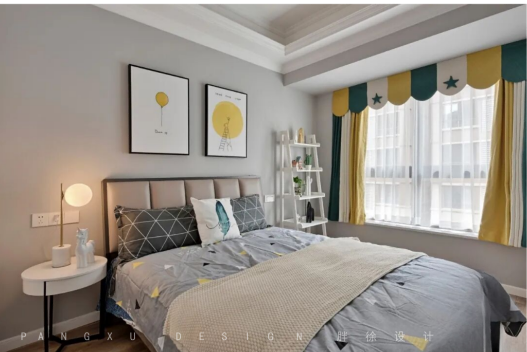 @胖徐设计工作室:儿童房的设计师考量到屋主的小朋友是一个5岁的男孩,年纪正好处于幼儿园和小学的切换中,所以设计师在设计上就没有采用卡通为主的适合低龄儿童的风格,还是主空间的风格进行呼应,只是在装饰画和窗帘上采用了一点俏皮的处理方式。