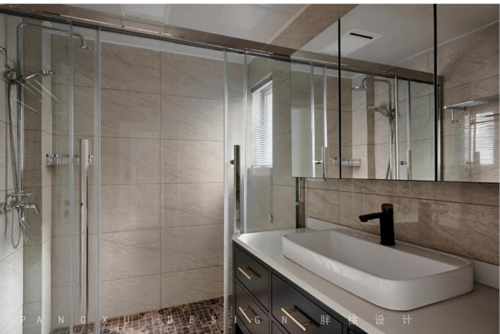 @胖徐设计工作室:卫生间在设计上地面专门用大理石做了拉槽的防滑处理,2米长的洗脸台的尺寸日常使用的同时也满足了女主人对于化妆的使用。