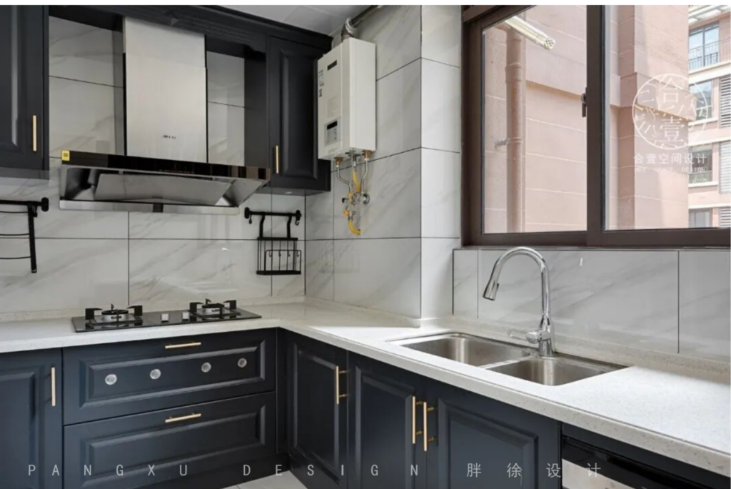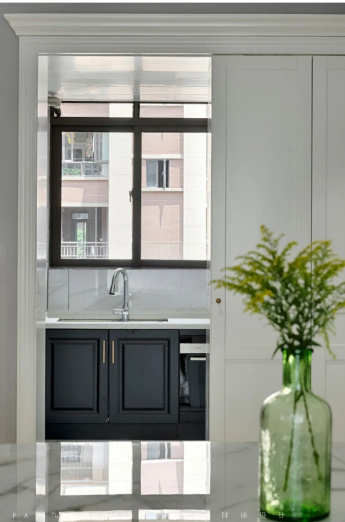 @胖徐设计工作室:房屋的入户鞋柜一直是设计上的难点,既要满足一家三口的储藏使用,又要让厨房的入口显得大气,所以设计师在厨房的入口处是把鞋柜和厨房门套做了一个统一的设计处理,这样同色系的门套加鞋柜让视觉空间显得完整大气。
