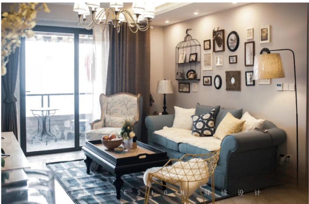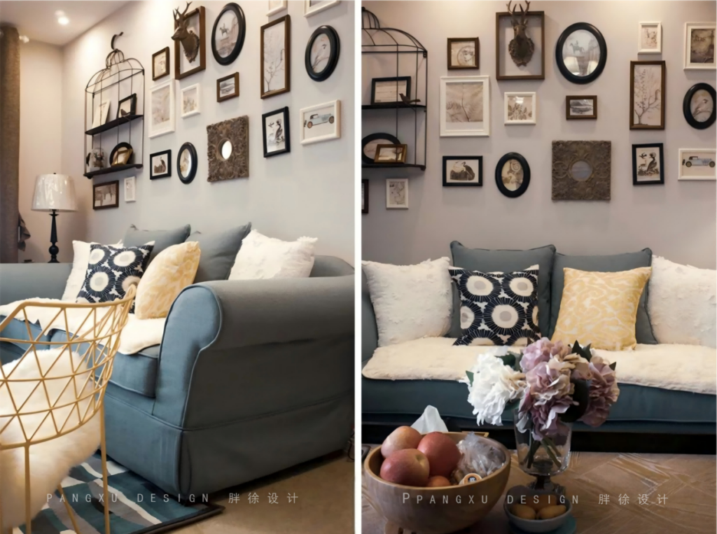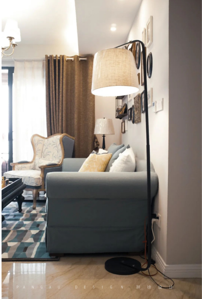 @胖徐设计工作室:客厅墙面融入浅灰乳胶,绿灰沙发相映地毯深浅相依,沙发背景墙装饰挂画高低不一,突显几分艺术气息,布艺灯罩的投入略显轻奢沉稳。