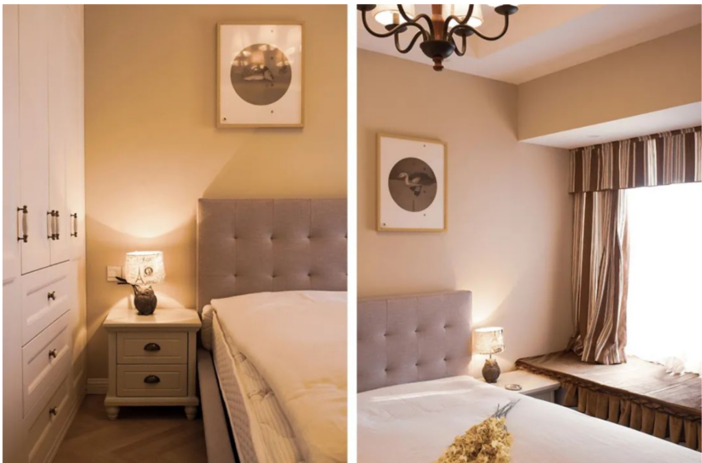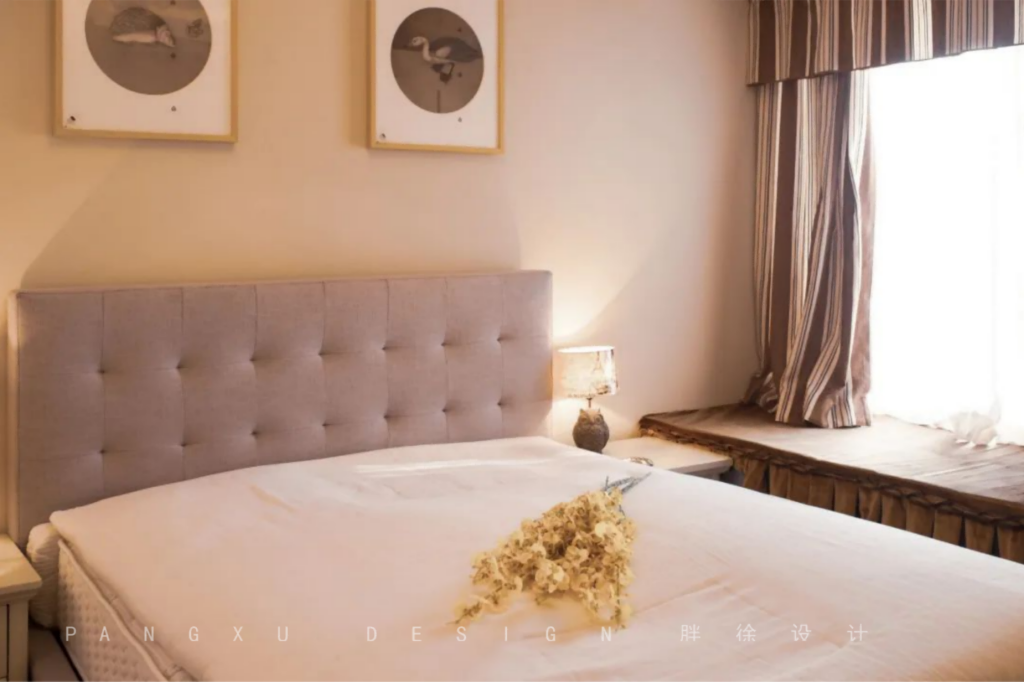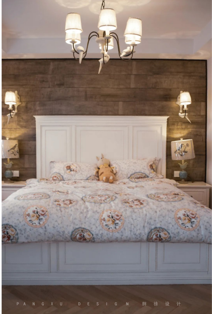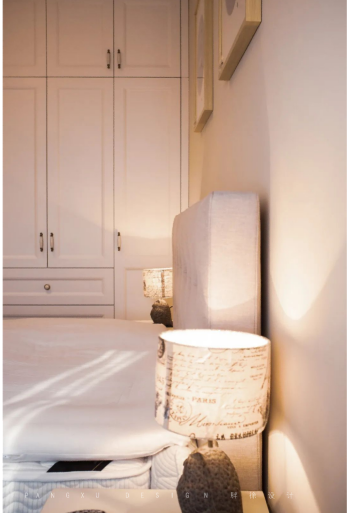 @胖徐设计工作室:石膏线勾勒床铺外板凸显层次感,床背板与人字拼的栗色木地板融为一体,森林范儿十足,仿佛回归大自然。