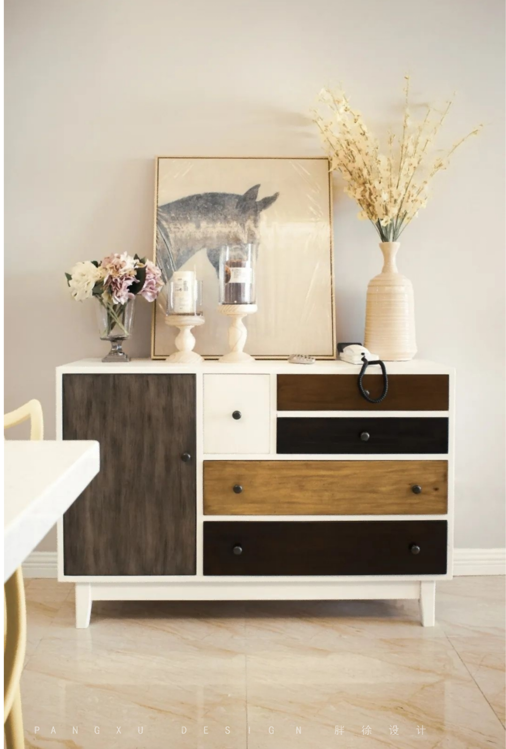 @胖徐设计工作室:原木六色斗柜,方便收纳。插花点缀客厅,春天又到赏花季,在家心境也惬意。