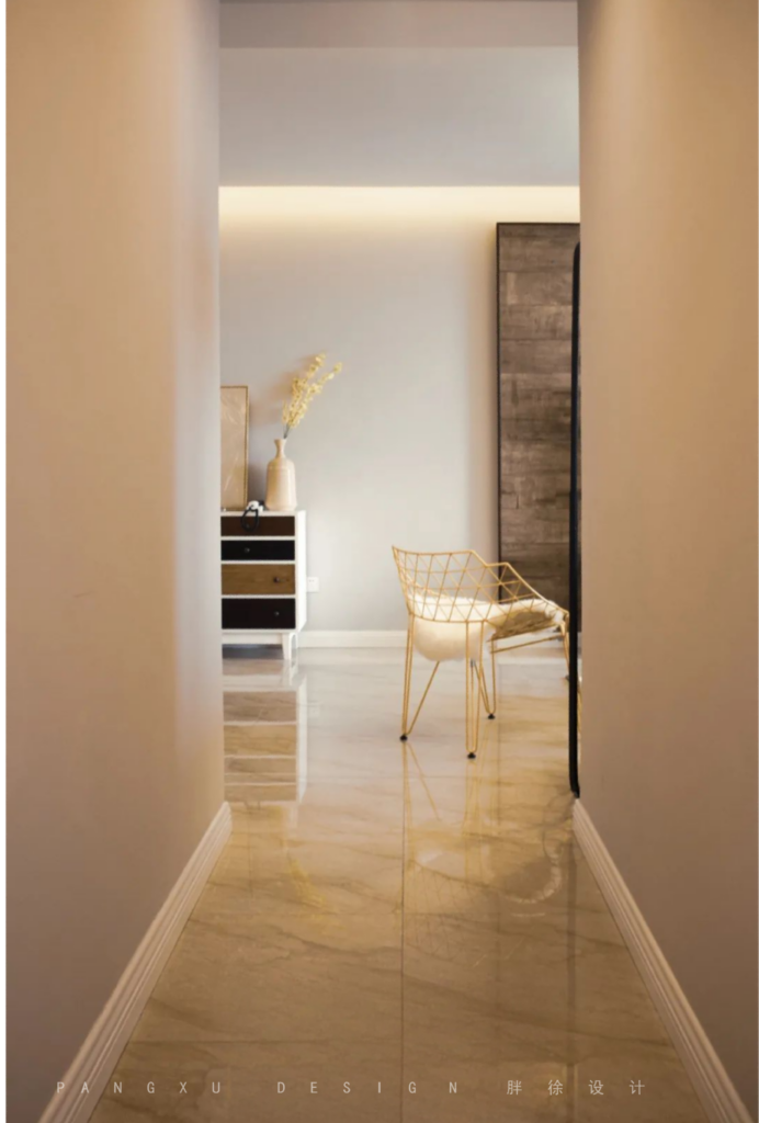 @胖徐设计工作室:条纹大理石地砖柔和视觉,其浅金的加入让空间升温,为居住带来暖意。