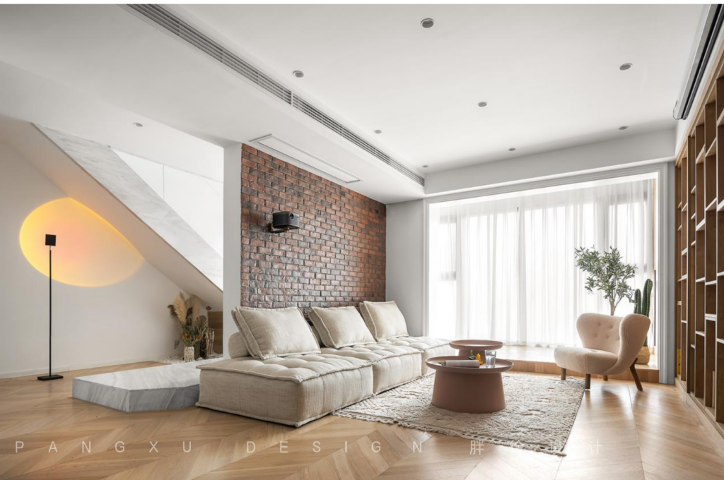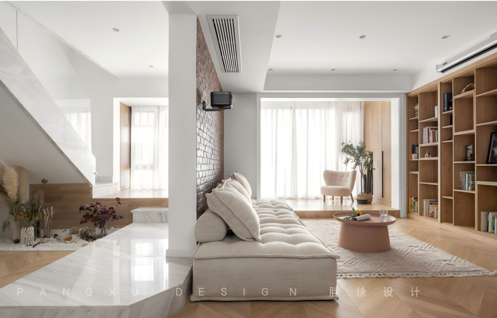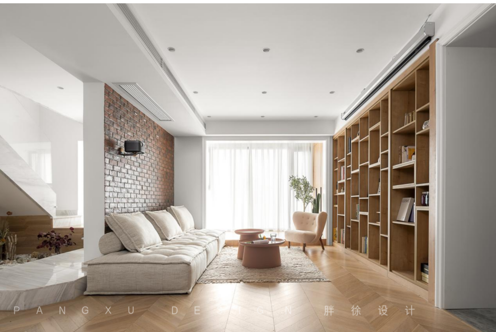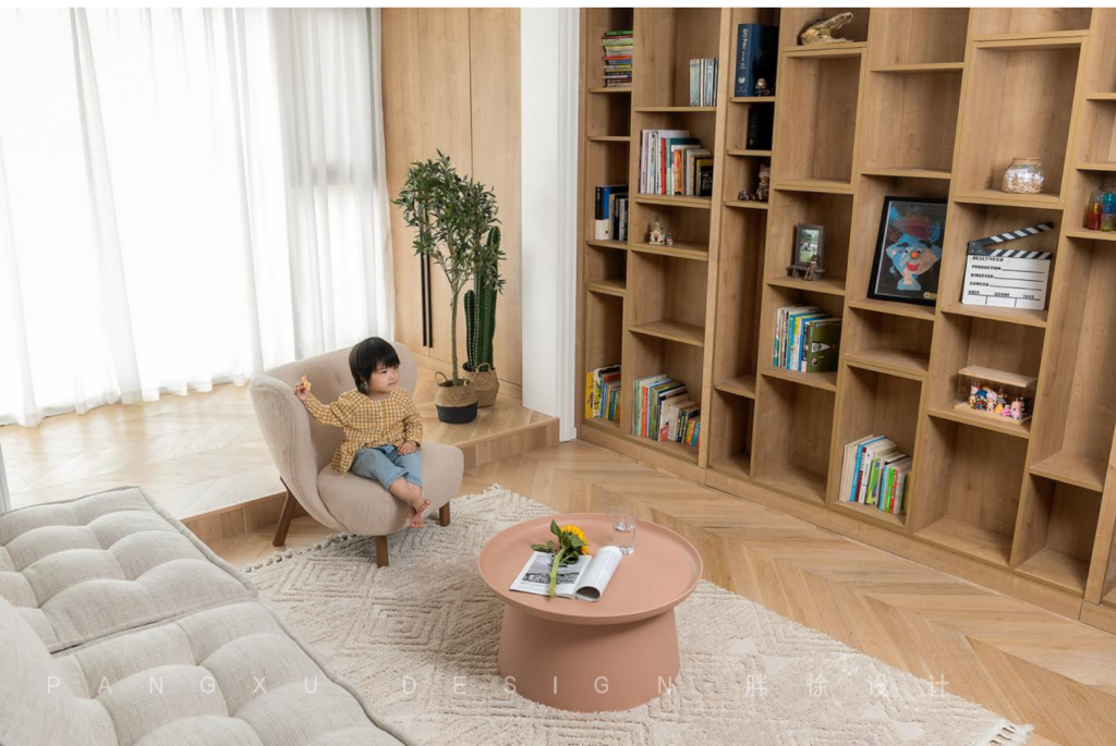 @胖徐设计工作室:羊羔毛抱抱沙发,毛茸茸的让人忍不住想摸一摸。深深陷入它的绵柔怀抱之中。纱幔后躲猫猫,地台上下蹦跶,沙发左右跳跃,地板静静看书,这里是丸子最喜欢的玩耍领域。