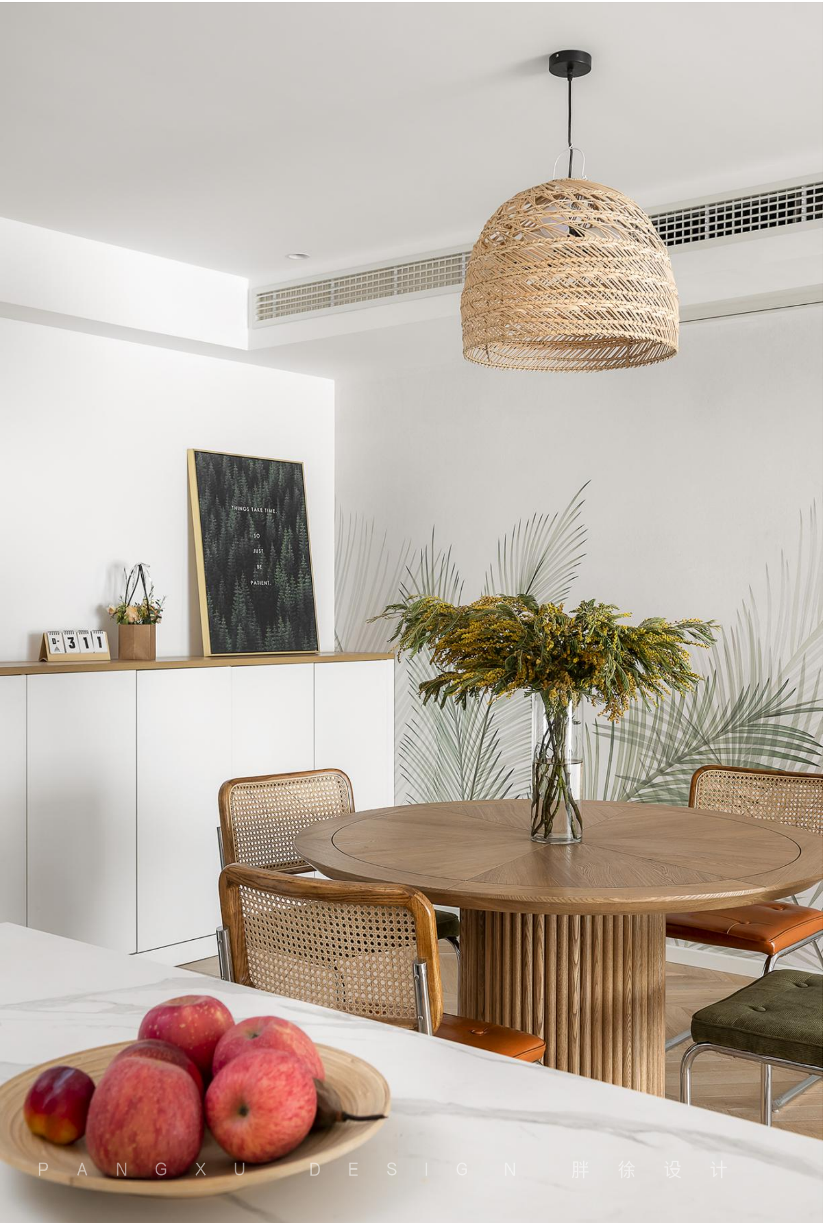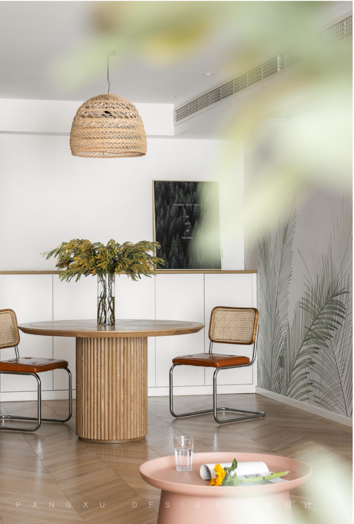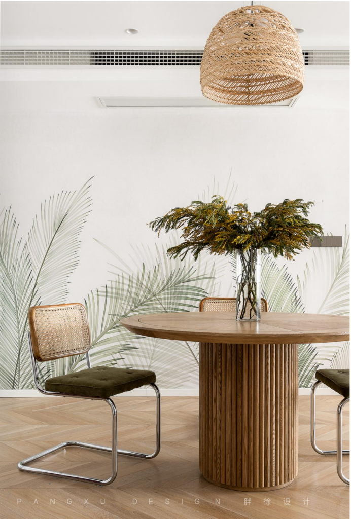 @胖徐设计工作室:夜晚藤编灯光下,一家三口围坐就餐。墙面的绿叶伸长,原木的餐桌椅,让人仿佛沐浴在森林户外的大自然中。