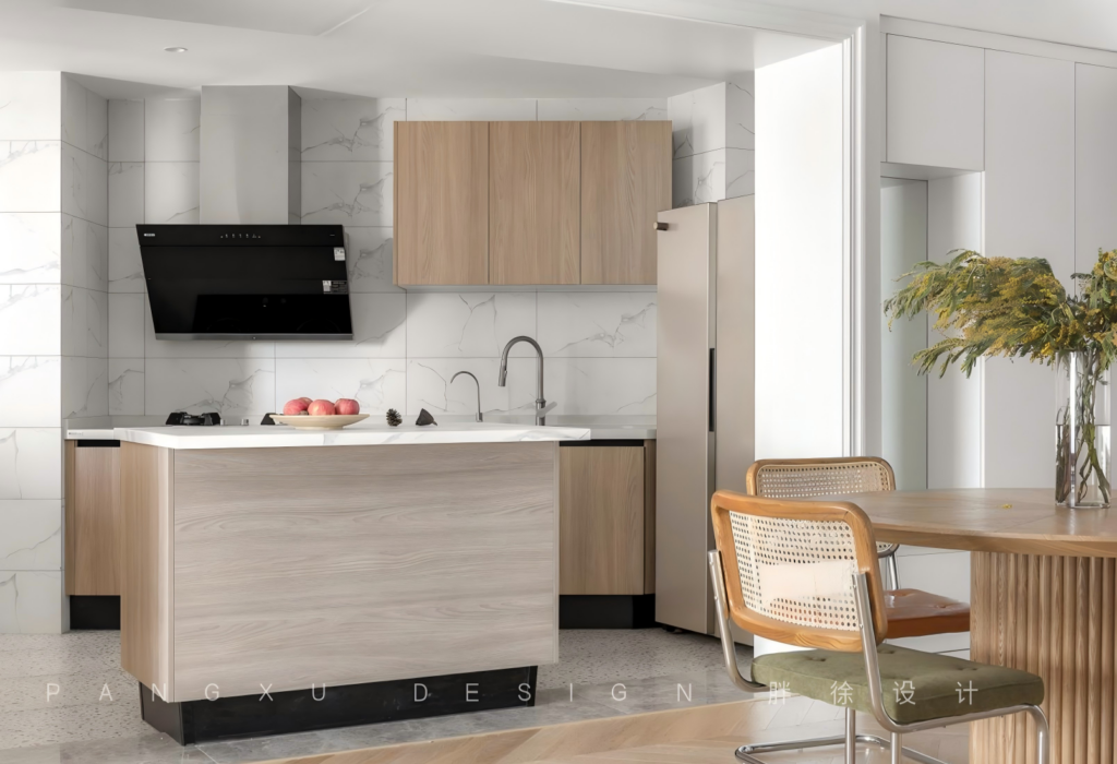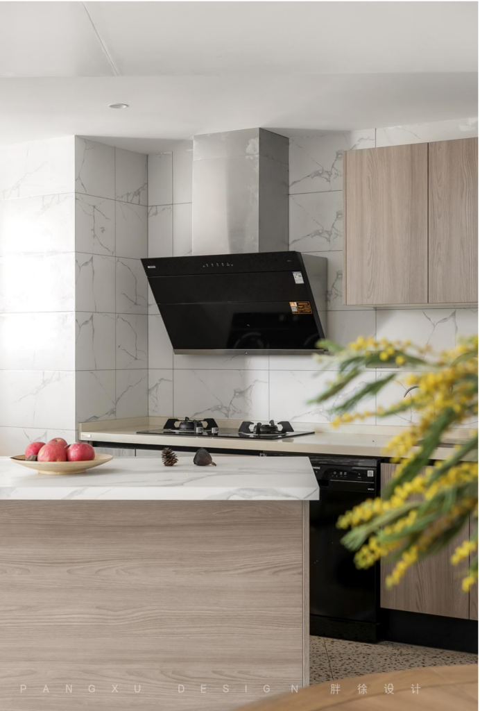 @胖徐设计工作室:每次下班归来,提着满满的果蔬美味,丸子爸和丸子在岛台上择菜分类,丸子妈在案台上切菜,翻炒,扑鼻的香味阵阵袭来。
