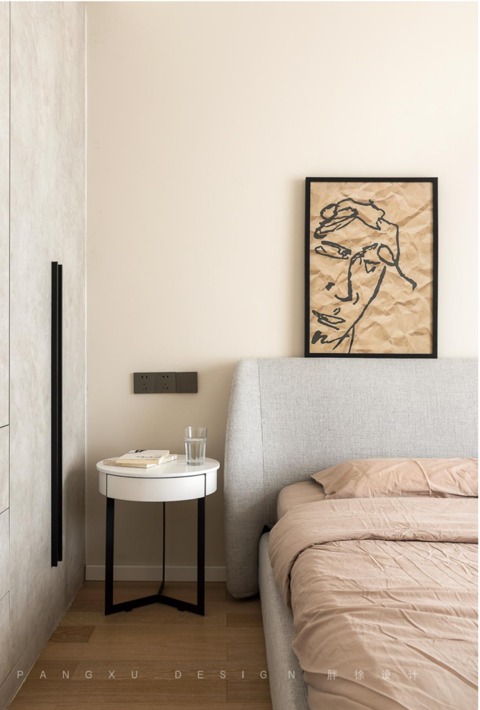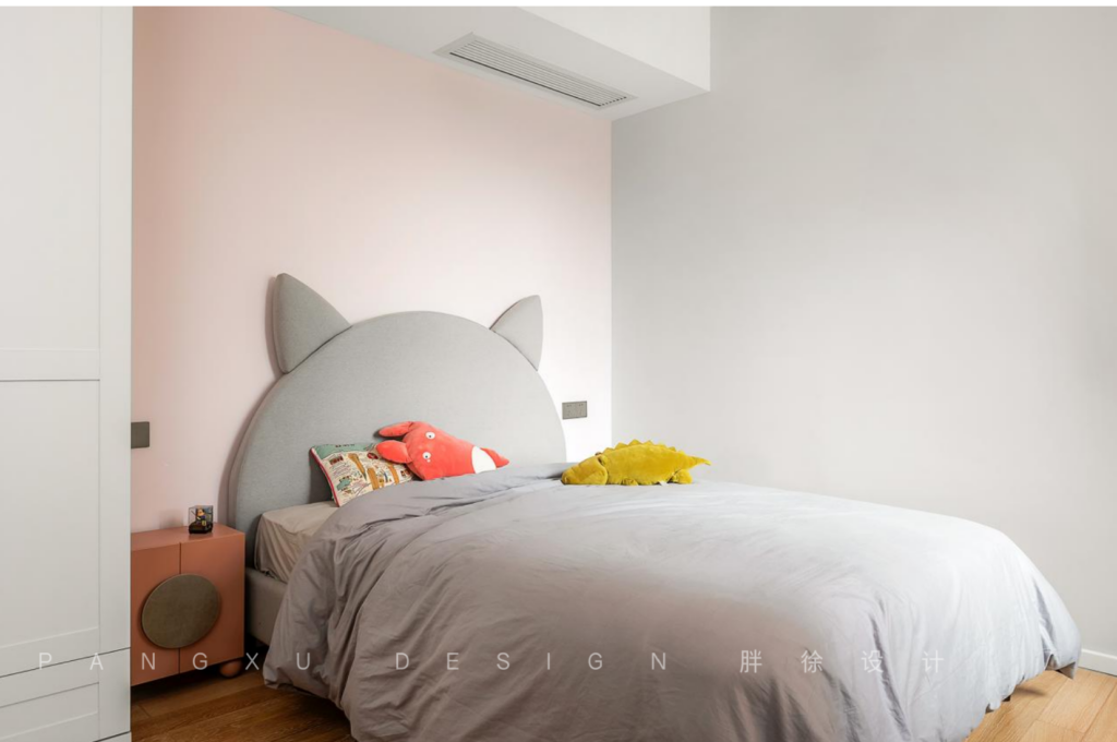 @胖徐设计工作室:灰色猫咪软包床,甜美小可爱。粉嫩背景墙和小小床头柜,公主风满满。