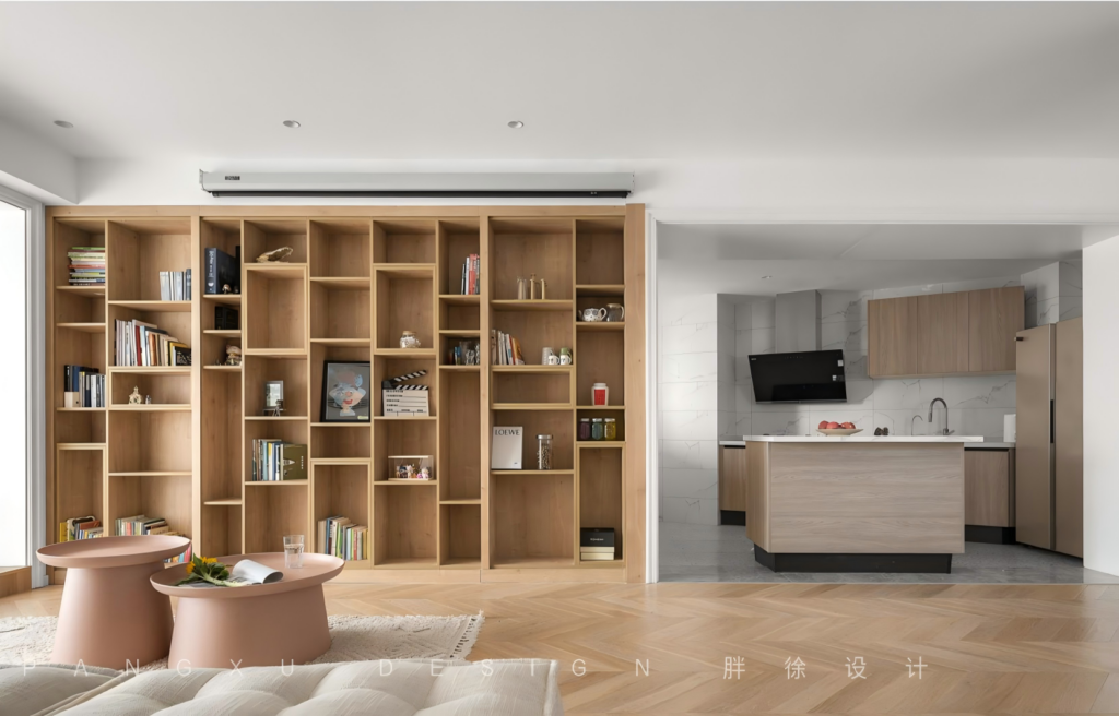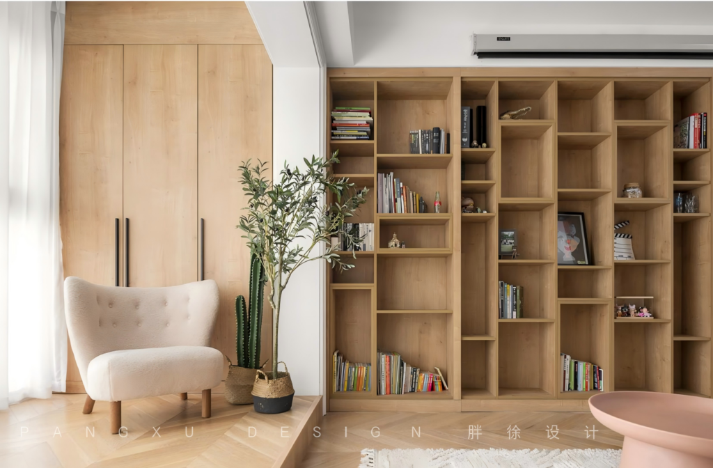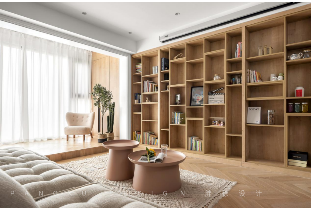 @胖徐设计工作室:整壁的书架和柜体,即可收纳不常用的物件,又可摆放一家喜欢的书本画册。高高低低的错落格子,即便小小的丸子,亦可伸手触碰那童话里神奇的美妙故事。偶尔记录生活小片的点点滴滴。