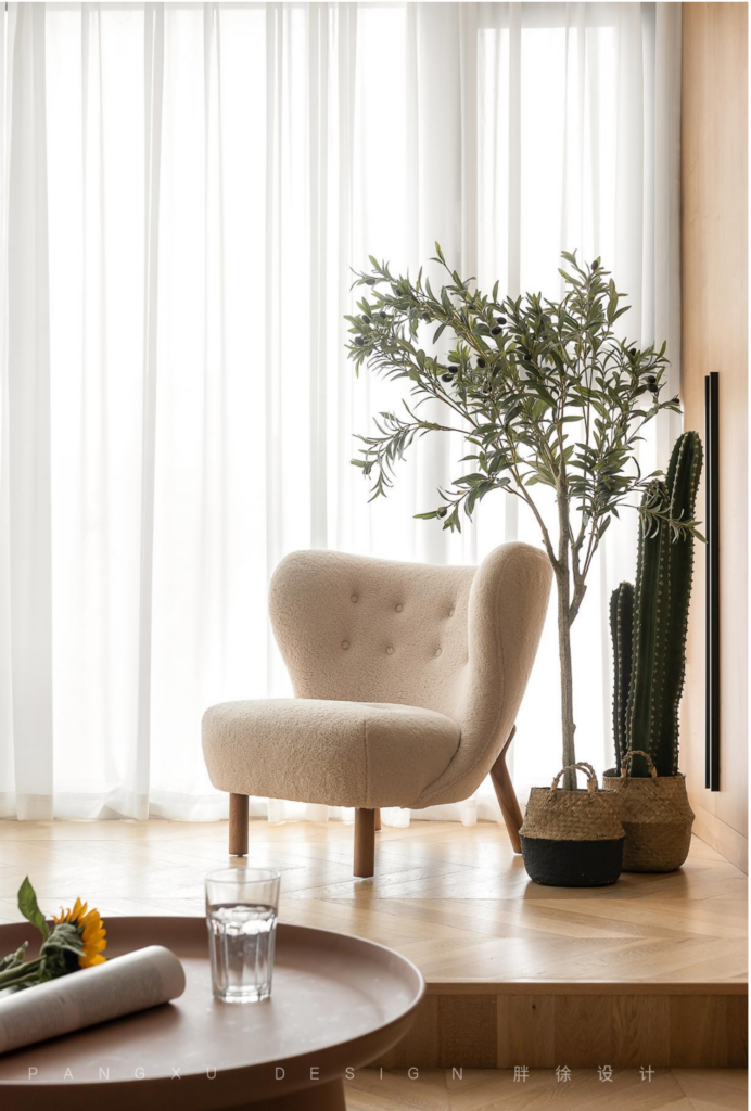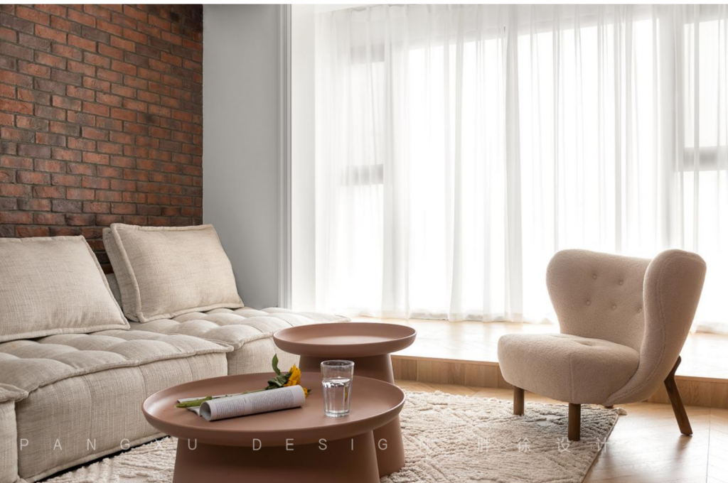 @胖徐设计工作室:方正通透的客餐厅,纱幔遮盖了大落地。背靠宽大的麻织布艺沙发,或坐、或躺、或跳跃,一起分享彼此的读物,一起倚靠看着荧幕上的”人生故事“。