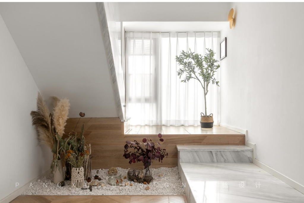 @胖徐设计工作室:拐进步梯口,侧面有个小小的沙砾景观。养些小金鱼,小乌龟,插些干花干树枝,点缀波西米亚风编织物和土陶物品,生活小趣味。