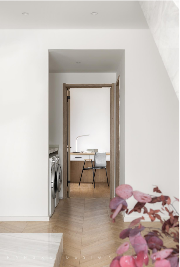 @胖徐设计工作室:小小的过道大大的用处。公区卫生间正对洗衣、烘干双机位,台上可堆放脏衣换洗物。多功能室,兼顾客房与书房。