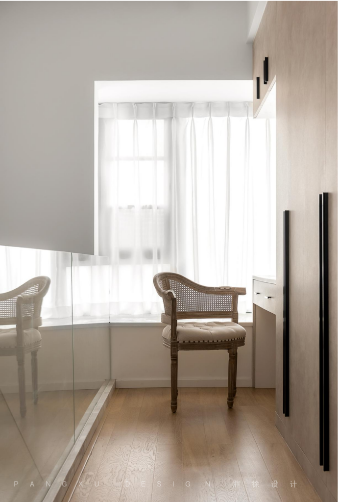 @胖徐设计工作室:二楼公区作大面积衣柜,补充主卧与儿童房衣物使用,开放式衣帽间。靠近窗边摆放一个兼顾化妆与工作的书桌,即便深夜加班还是清晨醒来妆容整理,都能侧头照看房中熟睡的孩子。