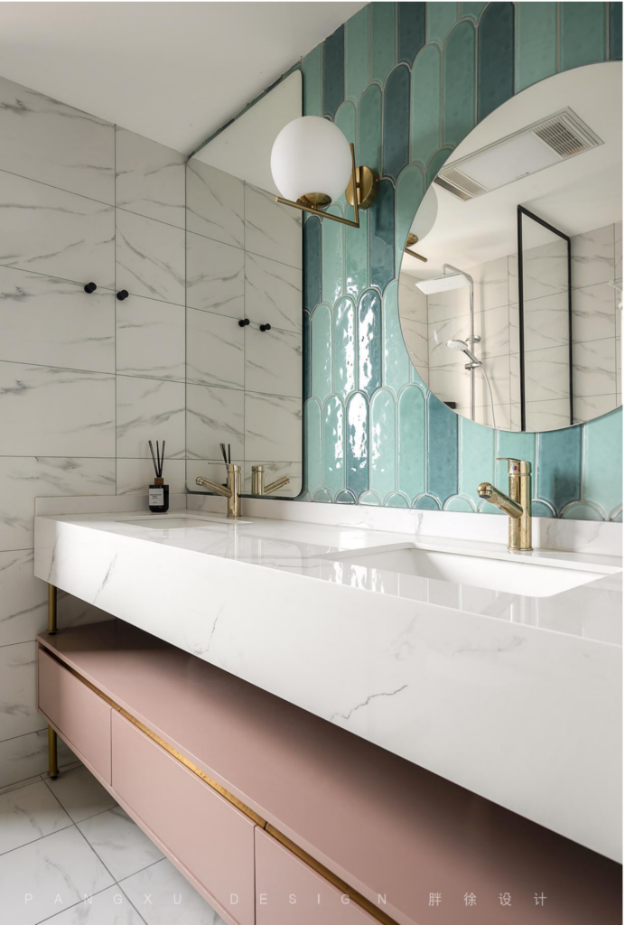 @胖徐设计工作室:间绿羽毛砖+素白石英石双台盆+雾粉金边储物柜,略带小清新。双镜面的光,折射出透亮干净的洗漱大空间。