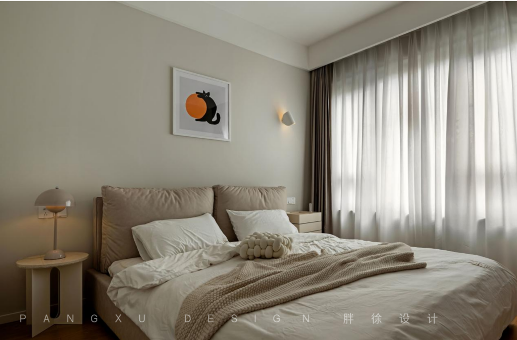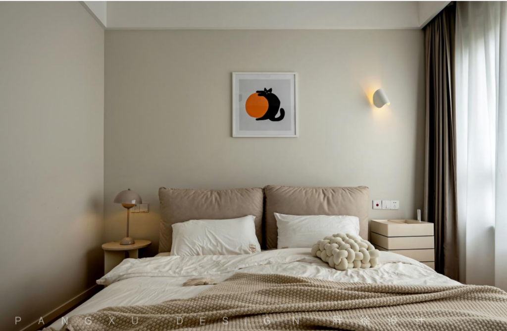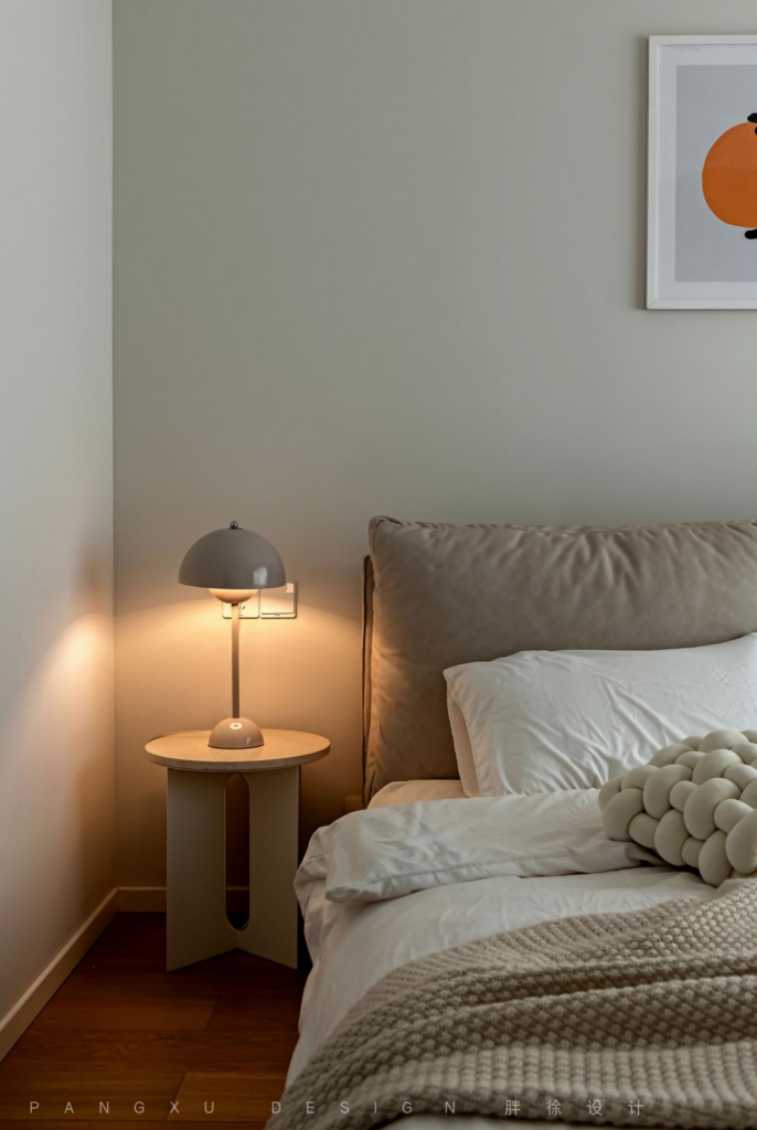 @胖徐设计工作室:低饱和度的色彩带来恰好的温柔,位于一侧的中古蘑菇灯,营造出温馨的慵懒氛围感,足以独享于此的静谧怡然。