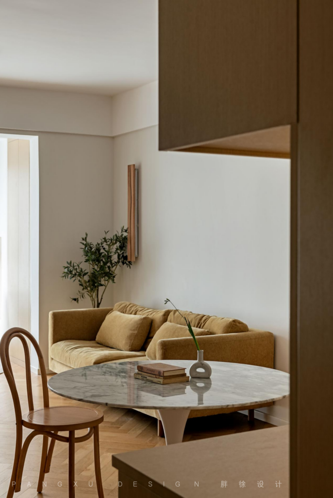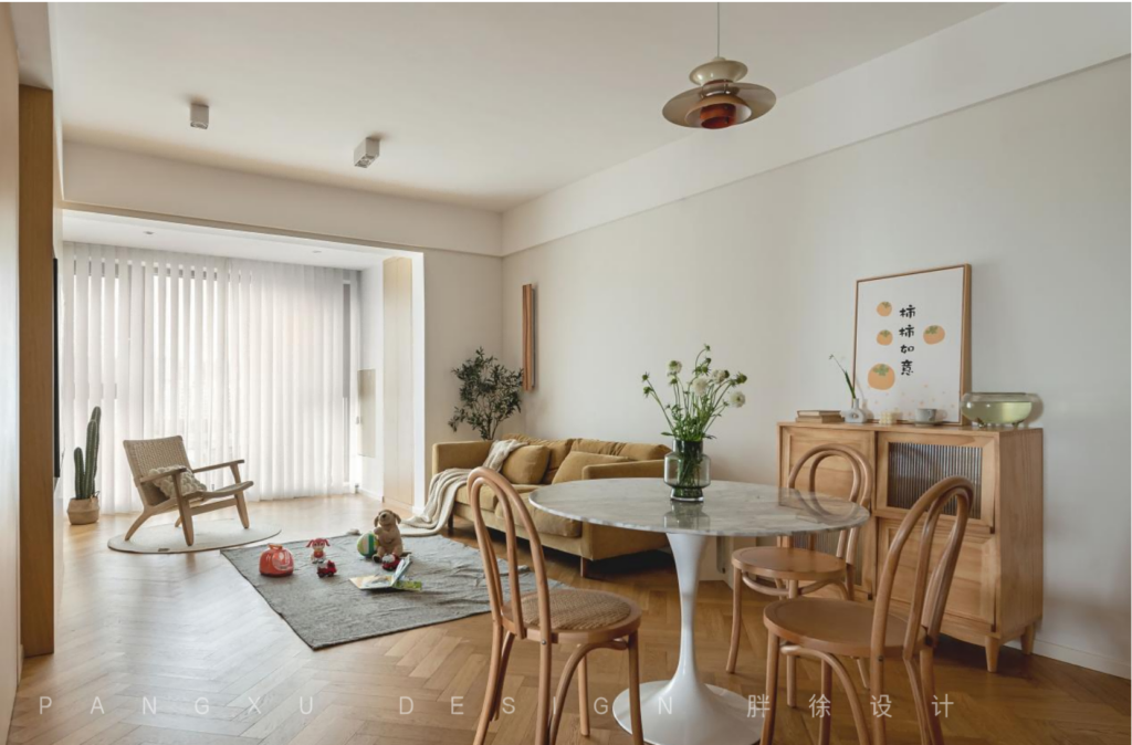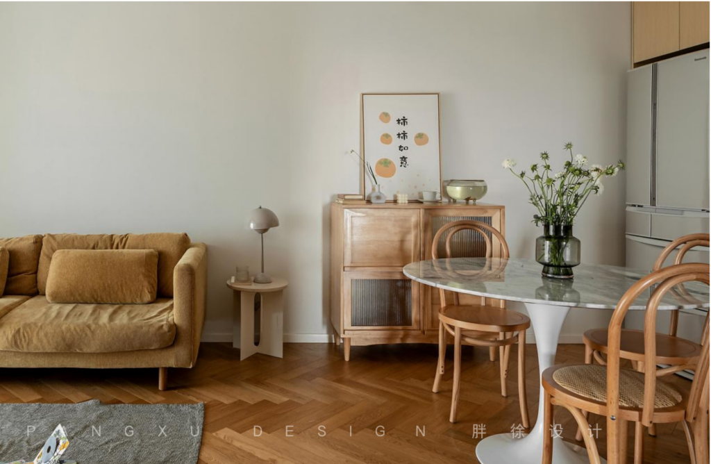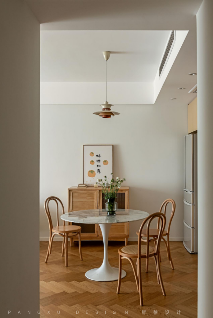 @胖徐设计工作室:餐厅延续了整屋的原木温柔感,小圆桌承载着一家人三餐的简单滋味。
