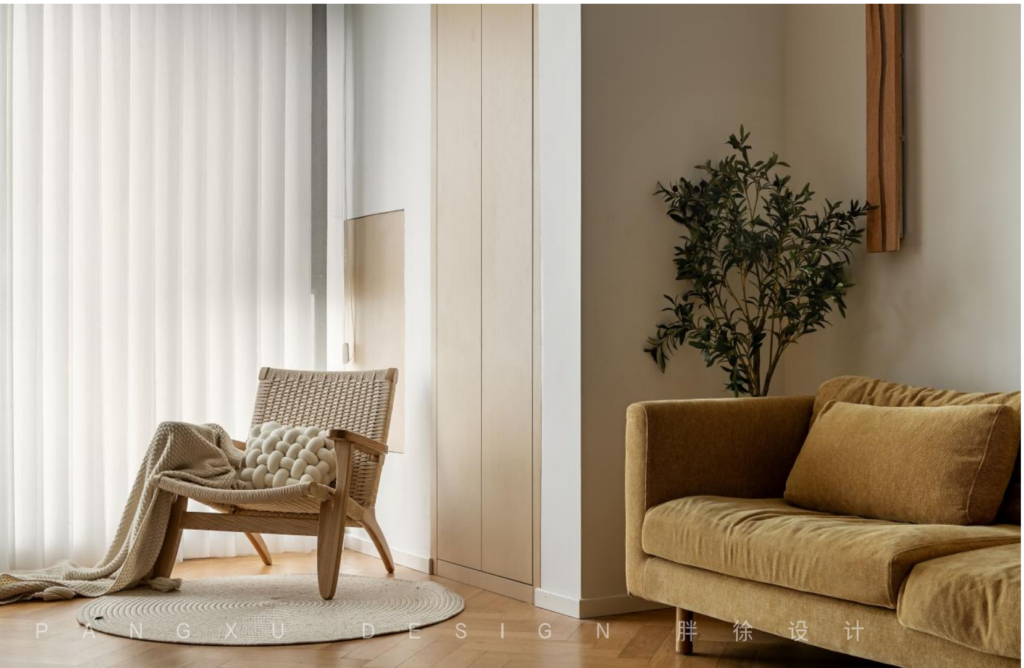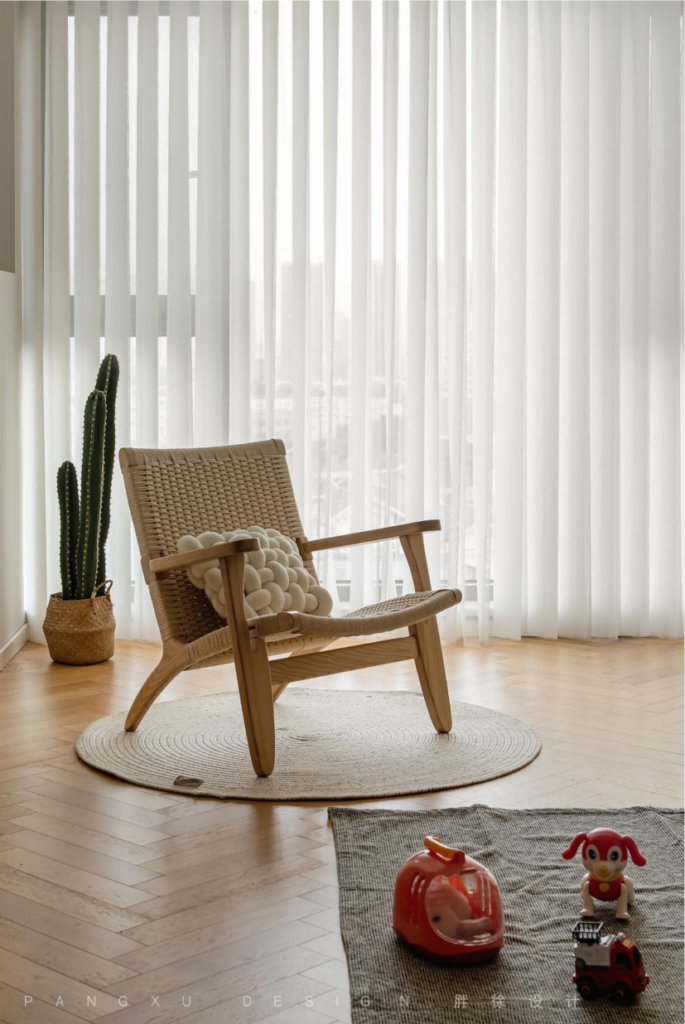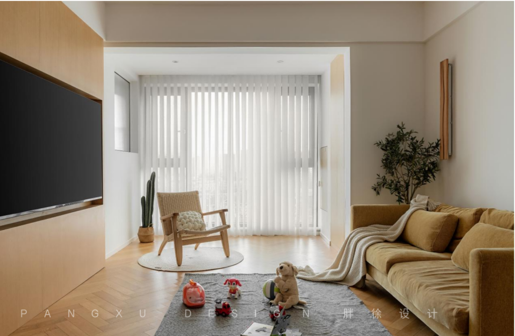 @胖徐设计工作室:整个客厅的色彩温暖明亮,温润的木地板契合于此的恬静,梦幻帘过滤的光线柔和,营造出温柔细腻的氛围感。