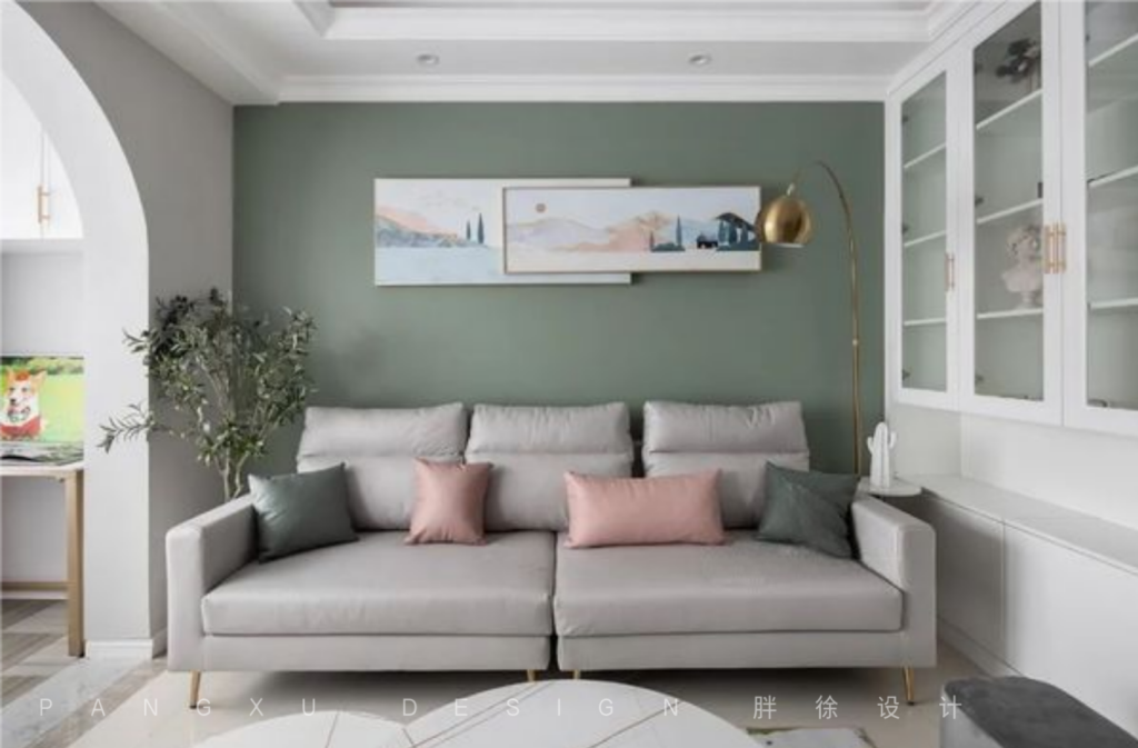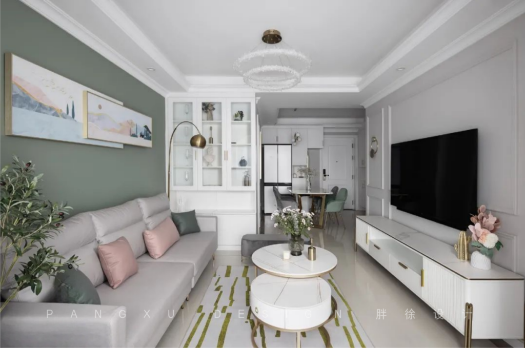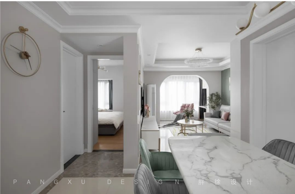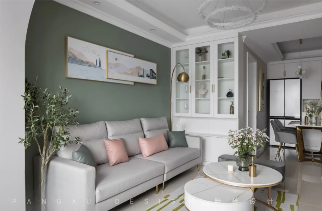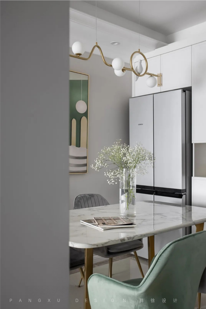 @胖徐设计工作室:入室素雅,低饱和度的苍筤色与灰调。搭配金属质感的家具细节,形成一个温馨北欧中带点小轻奢的调调。进门玄关添加右侧杂物柜体,在有限的空间里放置双开门冰箱。增大鞋帽杂物的储存空间。