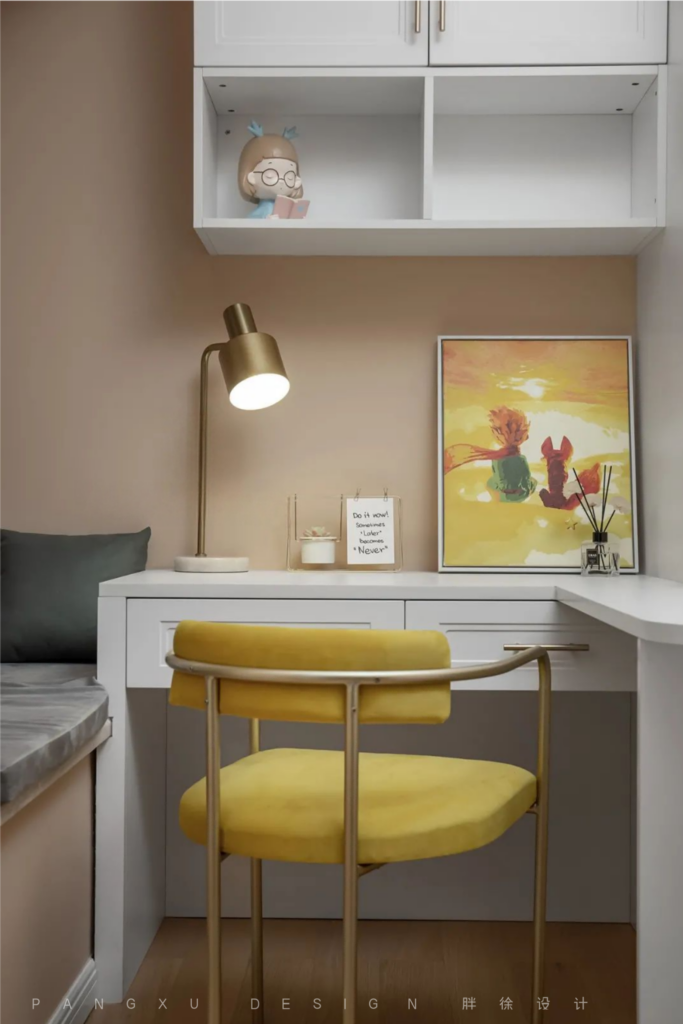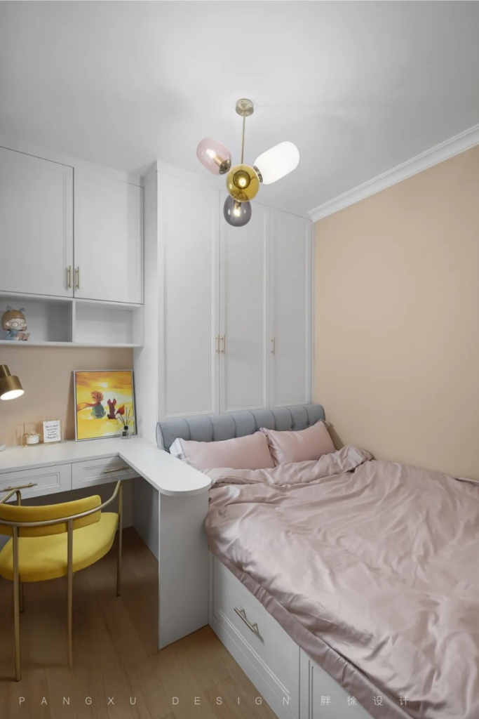 @胖徐设计工作室:局促的儿童房,柜、床一体定制。榻榻米与床头增加储物空间,L型桌面扩大使用面积并且起到防护作用。